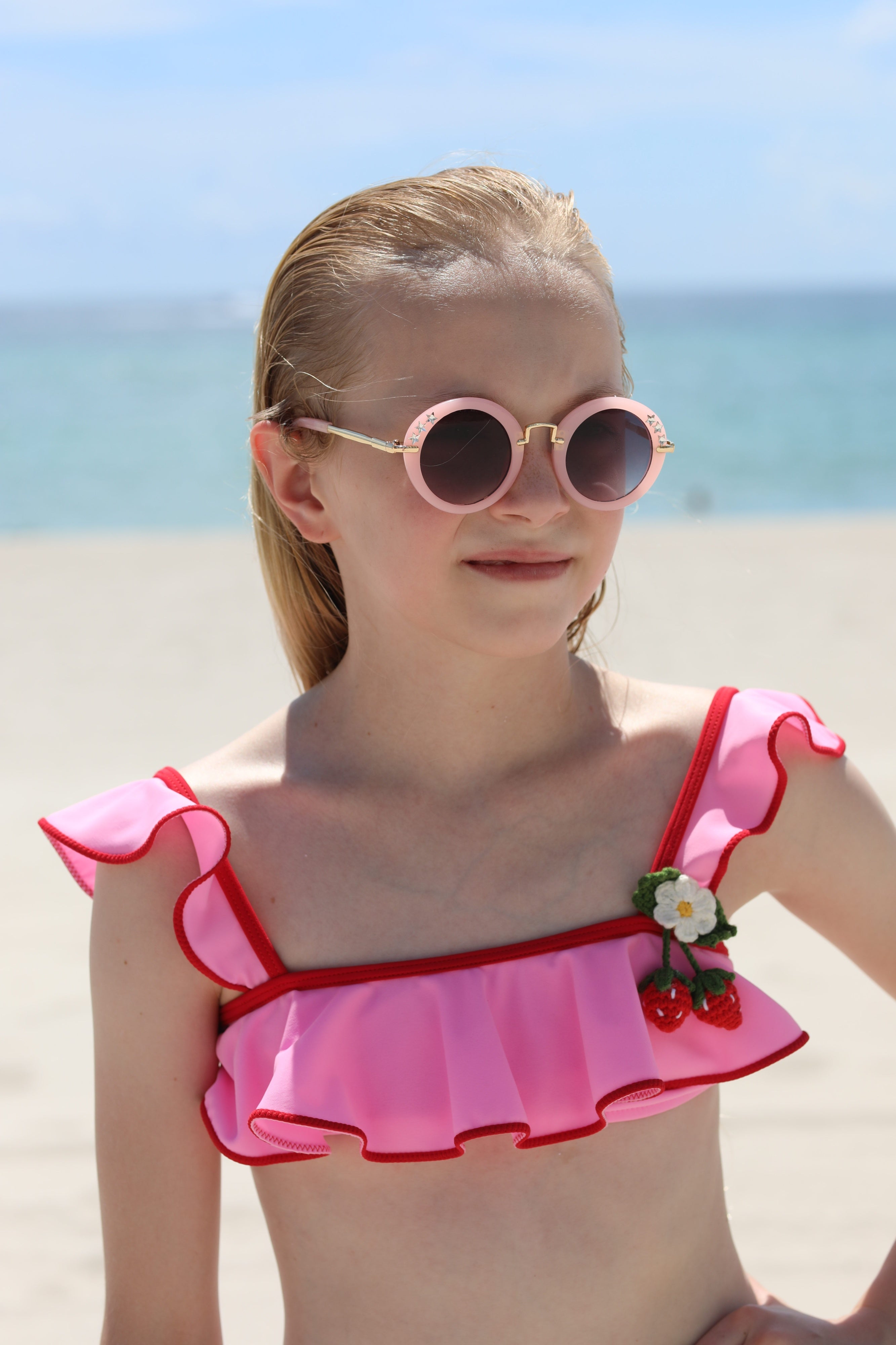 ARINA bikini is perfect for your little ones who want a bikini that is both stylis and comfortable. Made from best Italian fabric and gorgeous sewing labor. This swimsuit has great pink and strawberry print at the waist, with ruffles pink piping details on both the front and shoulders. There are two pieces of hand crochet 3D strawberry on the shoulders along with chamomile. Its ruffles are perfect for kids who want to add a touch of cuteness to their style.