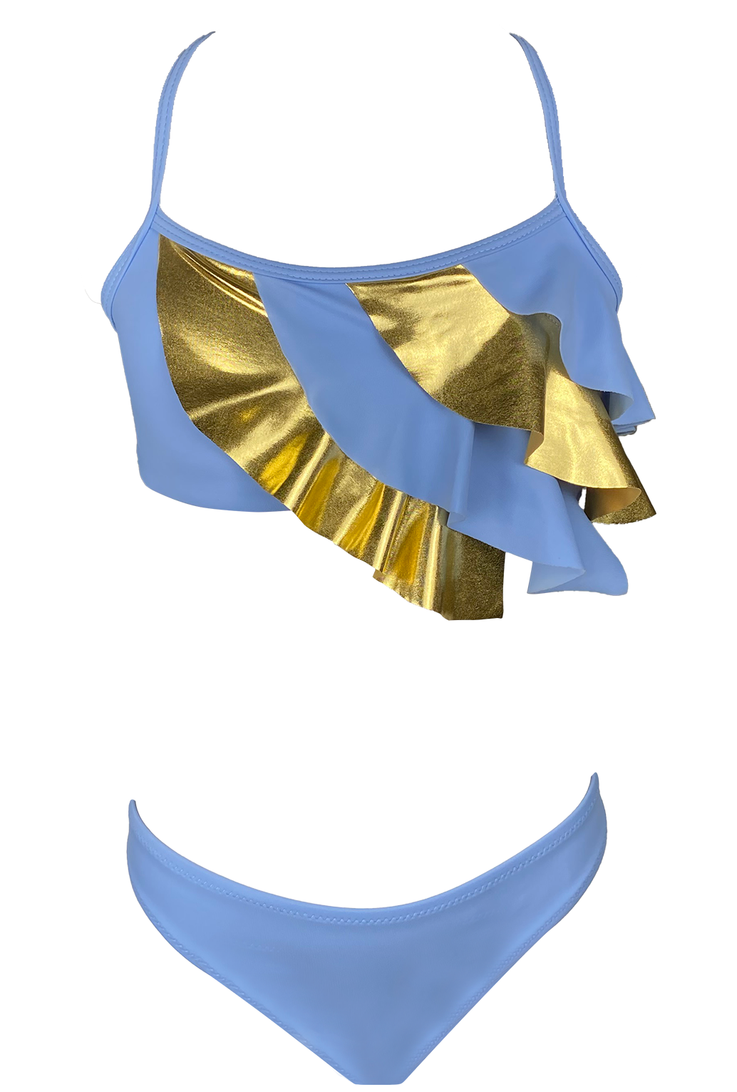 POLINA bikini is perfect for your little ones who want a swimsuit that is both stylis and comfortable. Made from best Italian fabric and gorgeous sewing labor. This swimsuit has great blue and golden color with ruffles. Make a splash in style with our stunning bikini featuring a golden custom-made print. Adaptable design features two adjustment points.