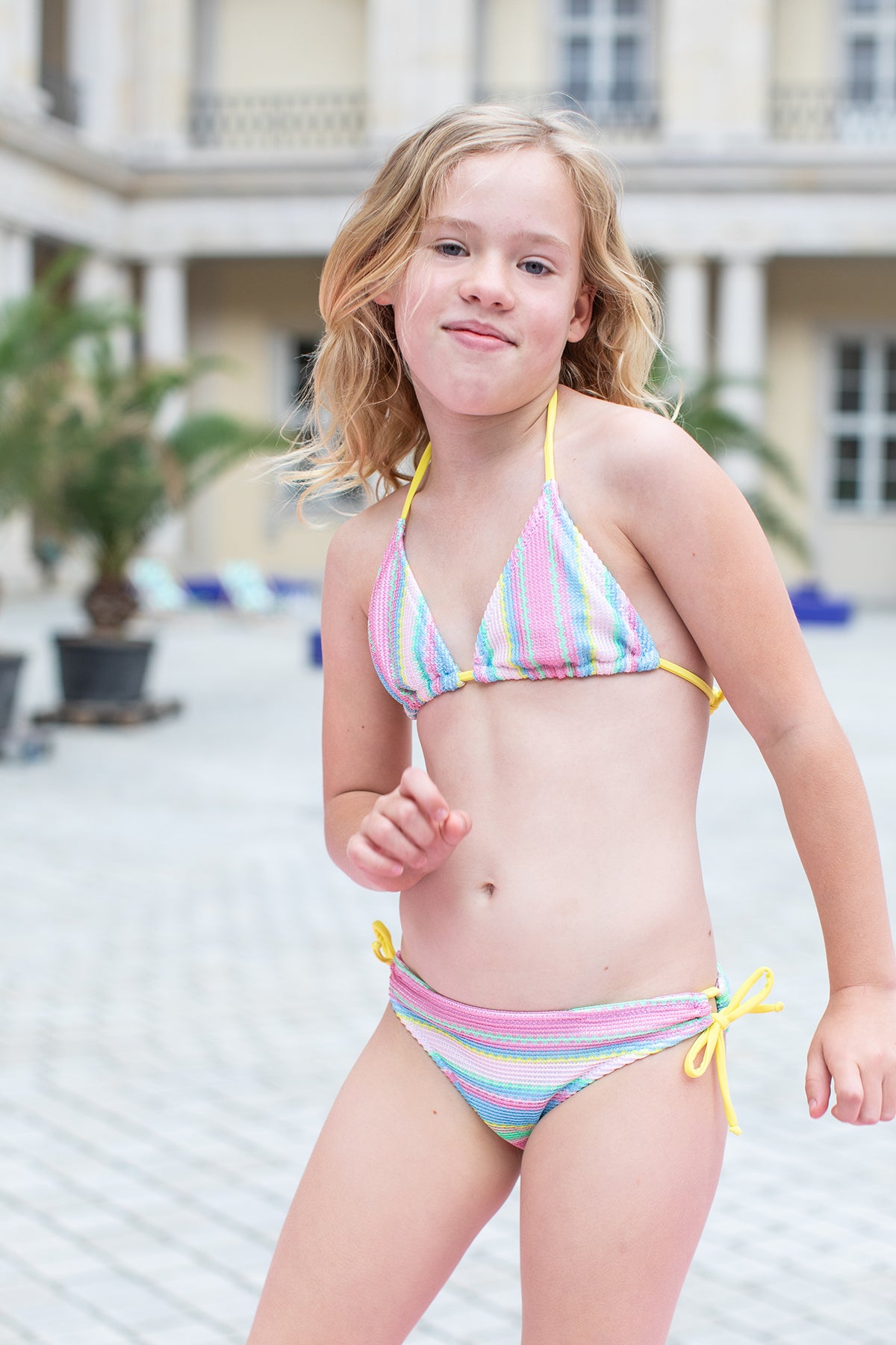 Looking for a unique and one-of-a-kind bikini for your little girl? Look no further than our triangle coloured striped patterned bikini!