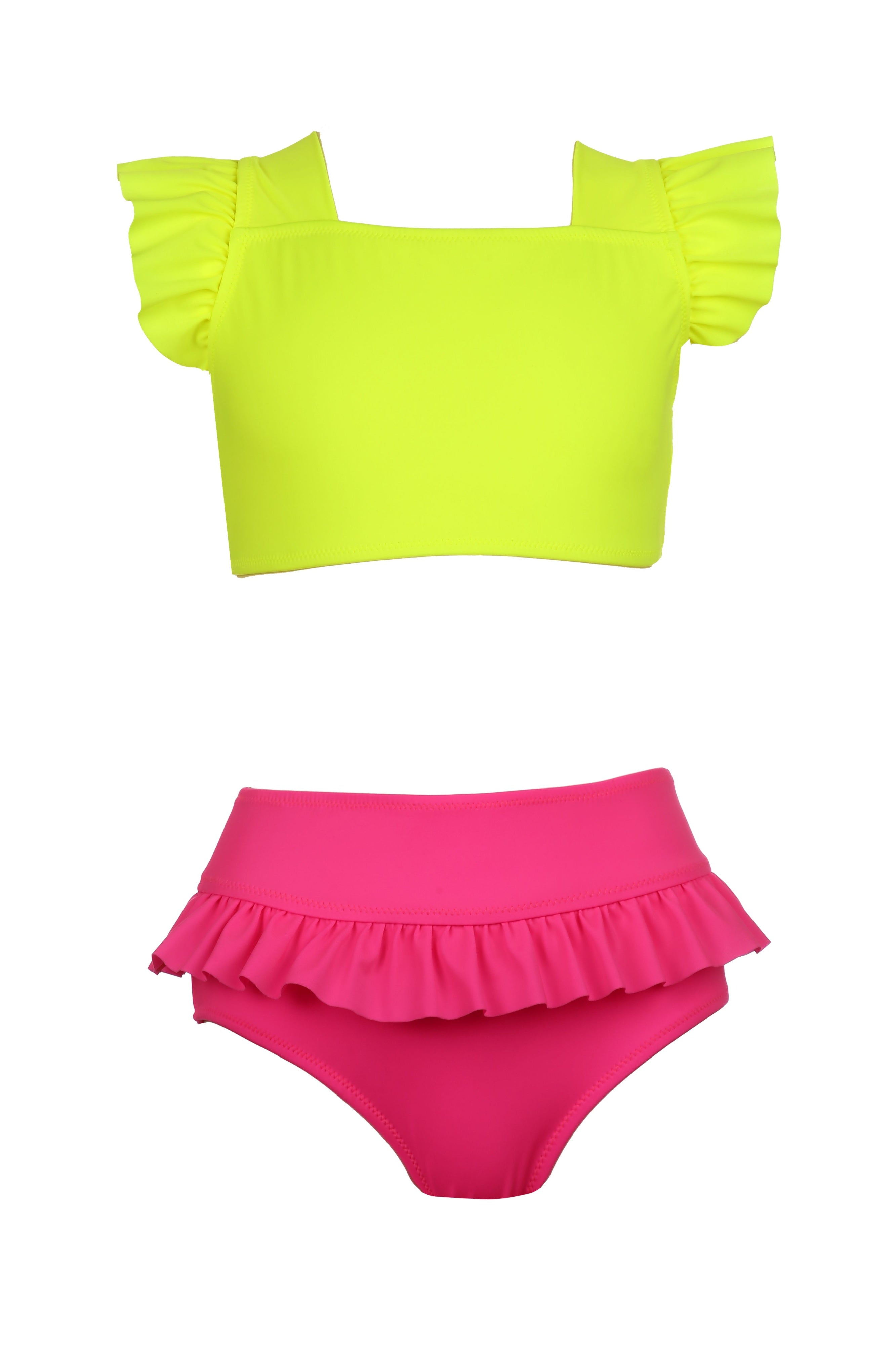 Neon yellow and pink colored cross-tie and adjustable girls' bikini with ruffled bottoms and shoulders