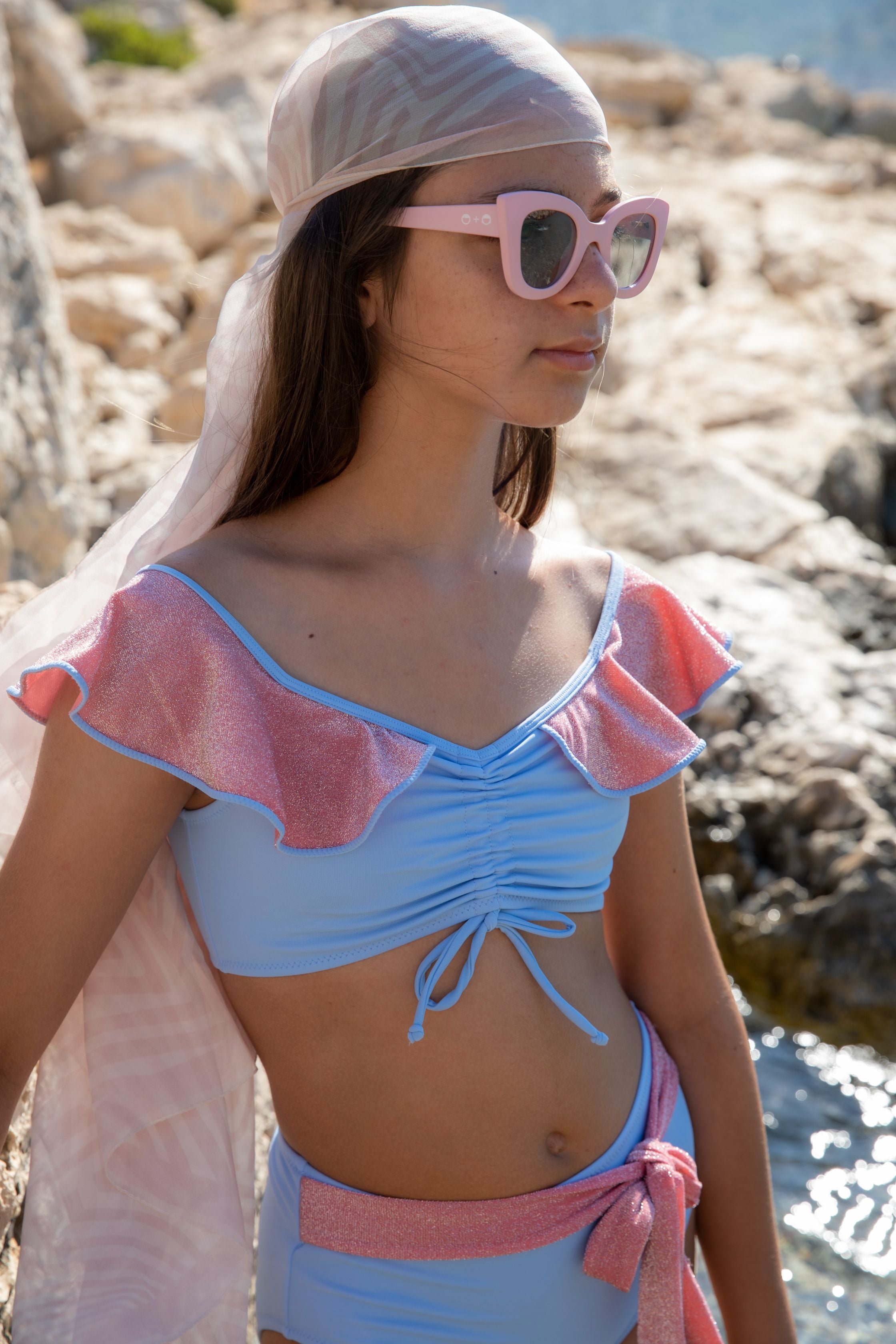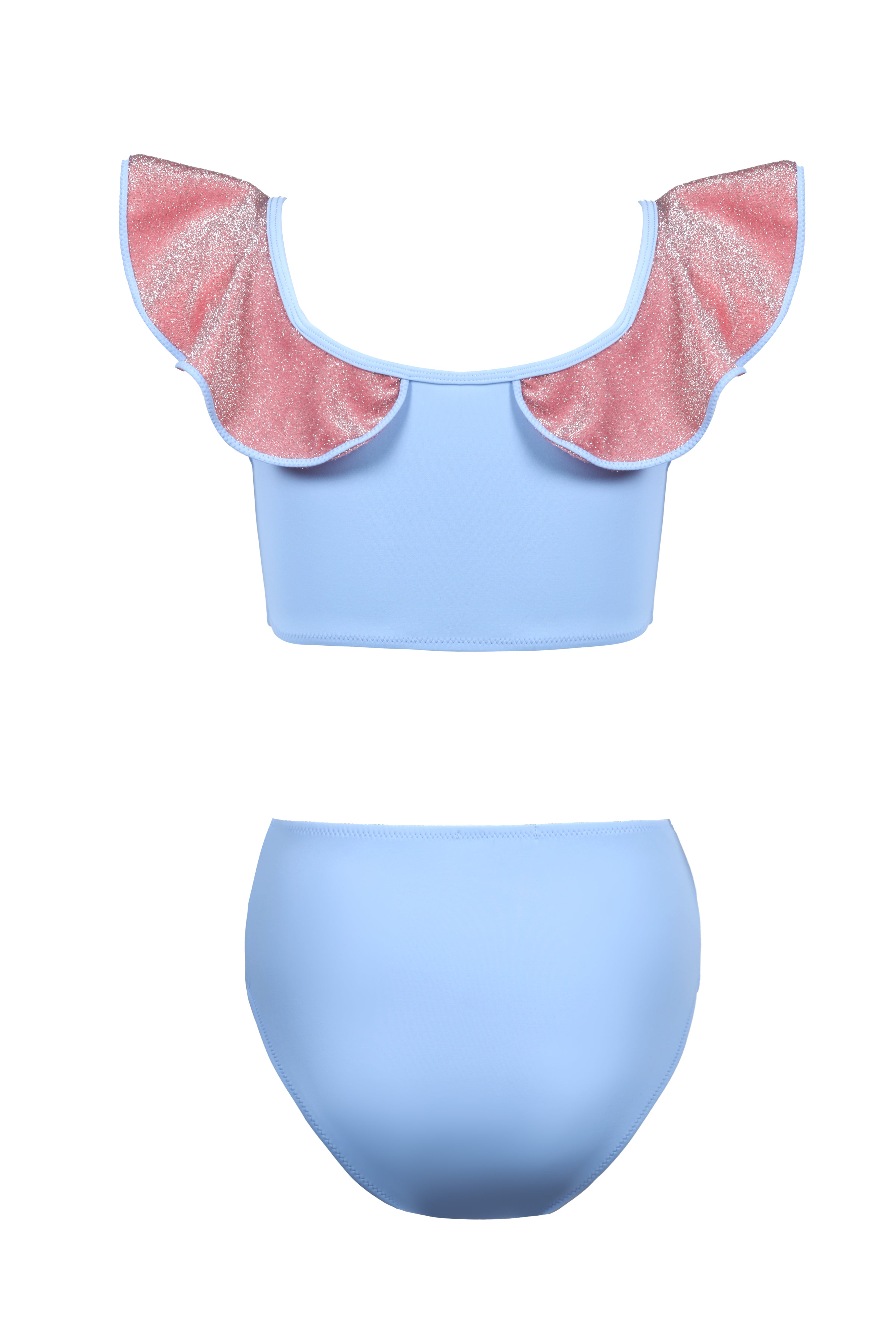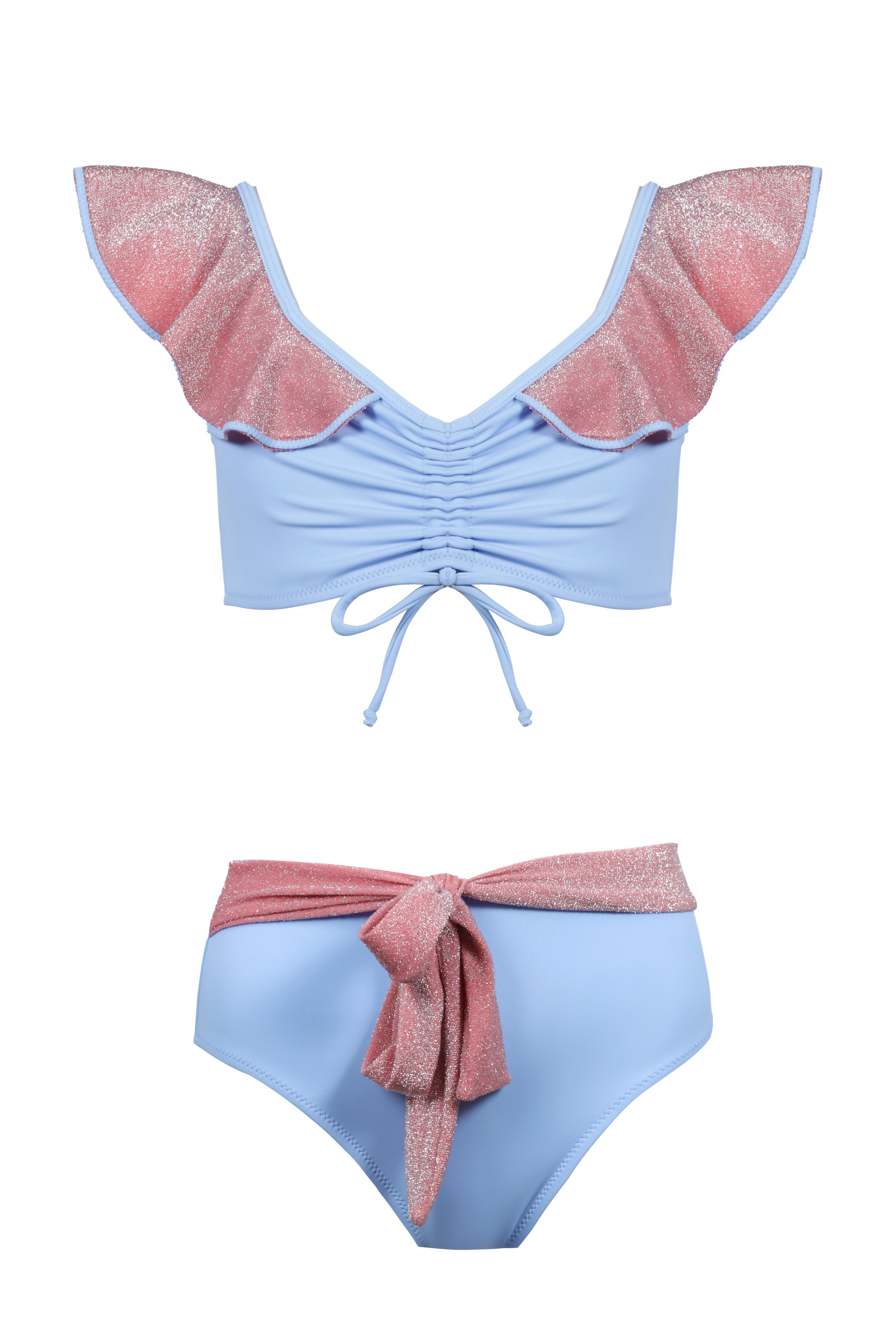 Soft pastels meet subtle sparkle in this dreamy bikini set. The ruched front and flutter ruffle sleeves add a feminine touch, while the shimmering rose-pink accents bring a hint of glamour. Designed with a flattering high-waist bottom and a glitter tie detail, this set blends elegance, comfort, and confidence for a truly radiant beach look.