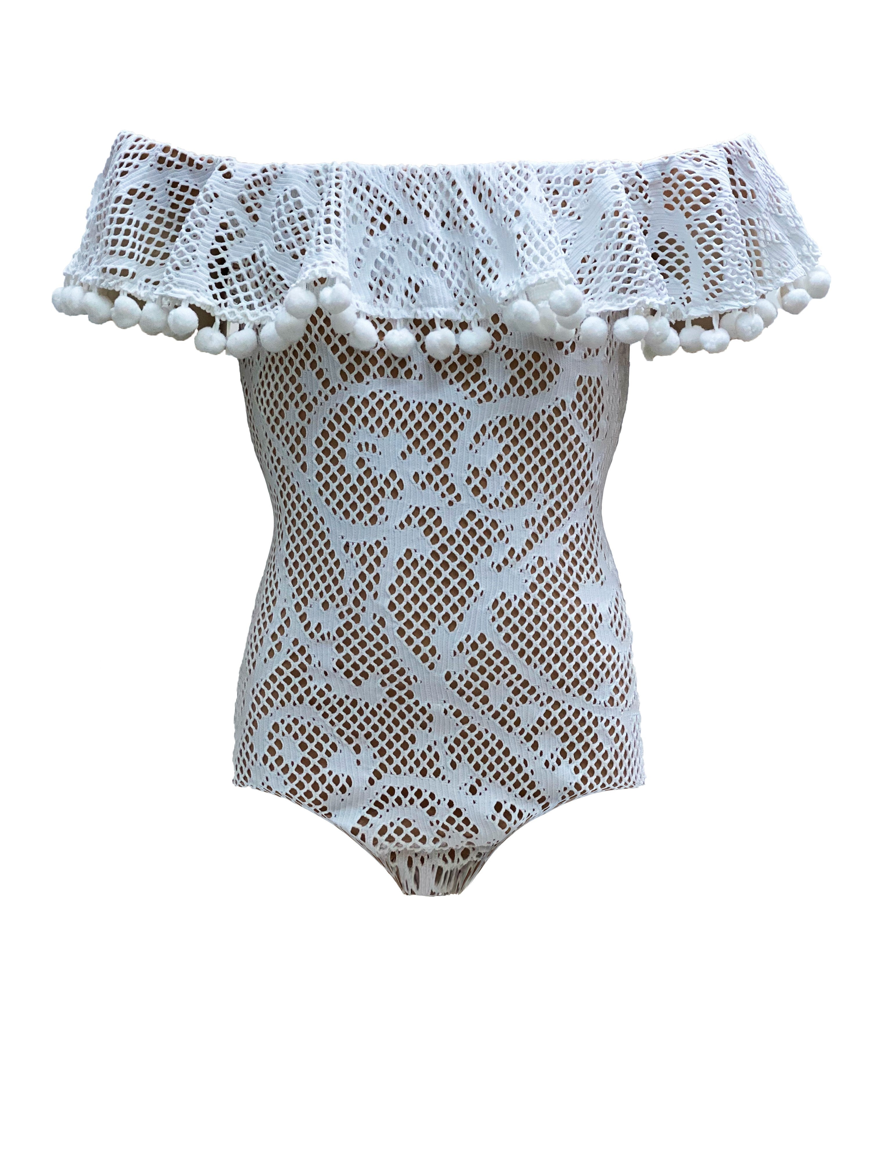 Teen girls white swimsuit by Nessi Byrd, made from stretchy white lace with a crocheted look. Practical and stylish, it has pom-pom trimmed ruffles and may be worn on or off the shoulder. It is made in stretchy nylon with UV50 sun protection and has a full beige lining for comfort and modesty.