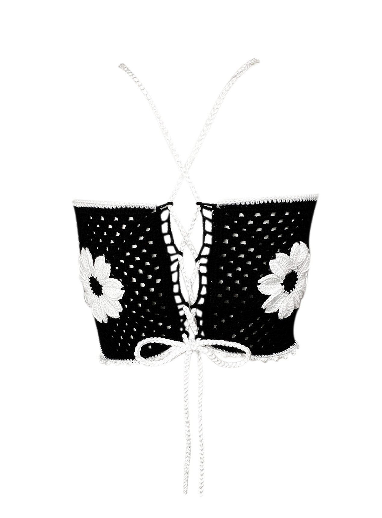 Chic black cropped crochet top for teen girls by swimwear brand Nessi Byrd, made in soft cotton. It has a hand-made crochet daisys on the front. It has scalloped trims and cross-over shoulder straps that lace up around the back and have fun white tassels.