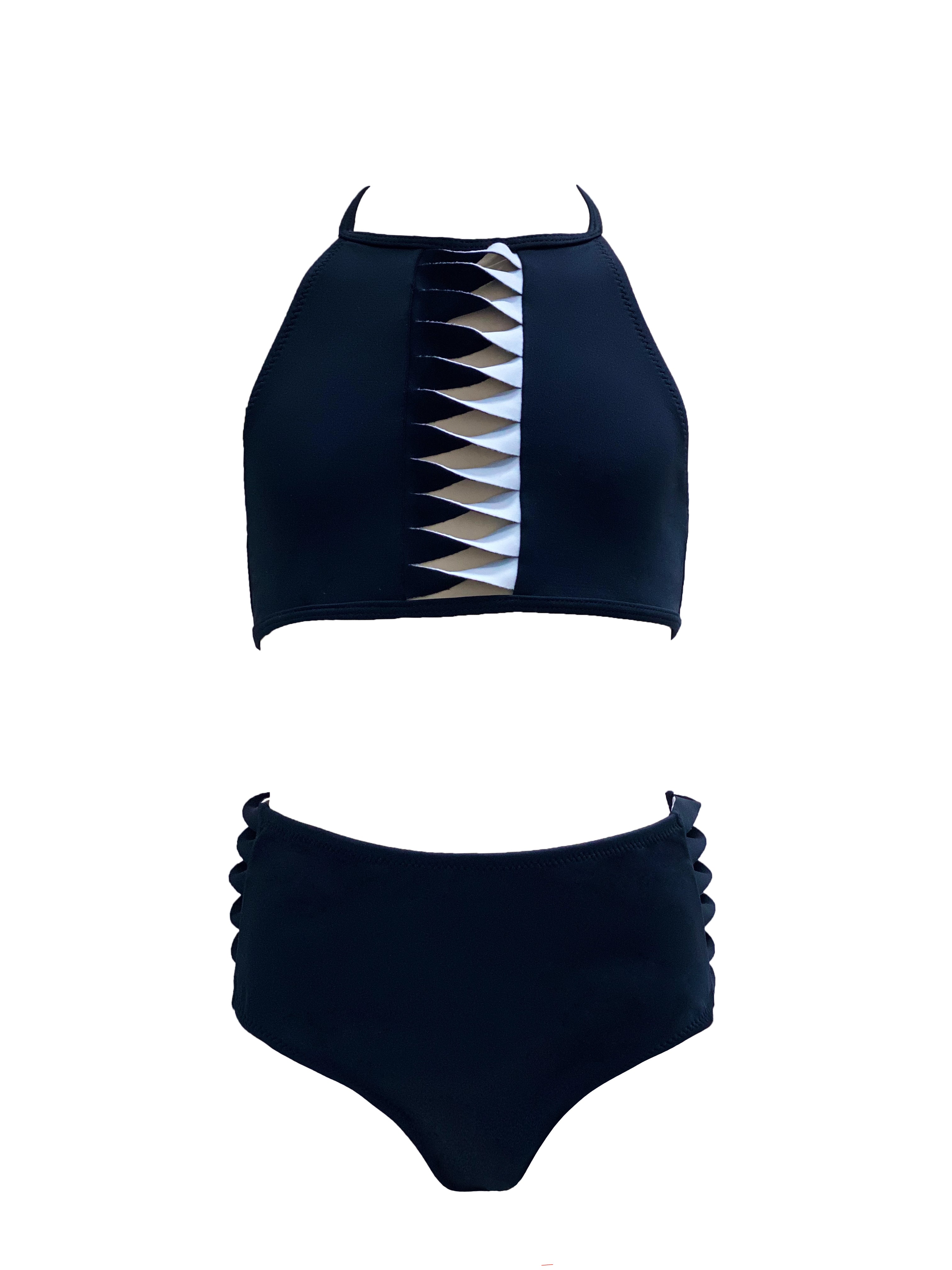 Turn heads with this black bikini set featuring a unique front window cut design. The high-neck silhouette combines sporty energy with a modern edge, while the contrast white details enhance its striking look. Perfect for confident beach days and poolside moments.
