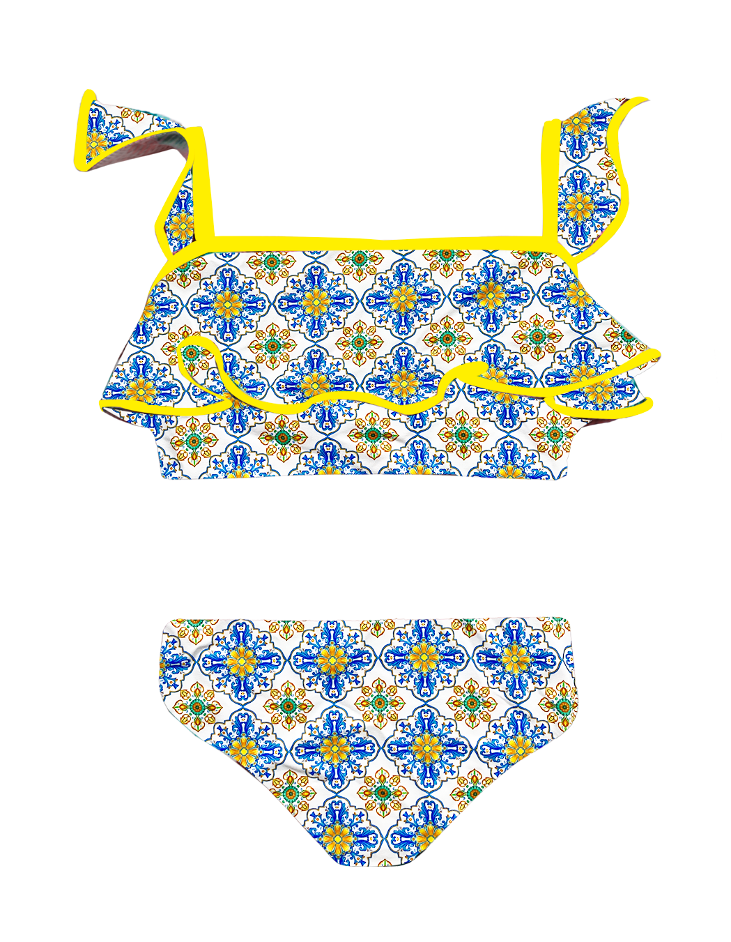 Tile-patterned bikini with yellow piping and tassel detail, gathered sides