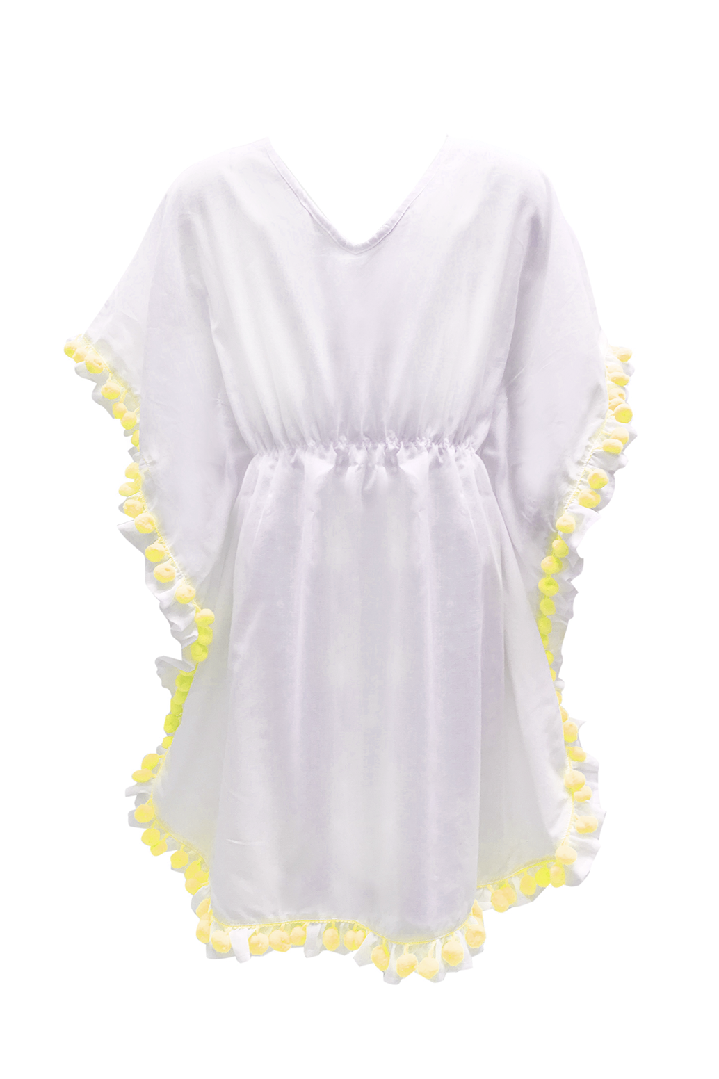 The white and yellow pompom dress is a stylish and versatile accessory that adds a touch of elegance to any outfit. Made with a soft and lightweight fabric, this dress is perfect for those warm summer days by the beach or poolside. With its pompom detailing, this dress exudes a playful and fun vibe, making it a must-have for your vacation wardrobe. Whether you're lounging by the water or strolling along the shore, this dress will keep you looking chic and fashionable.
