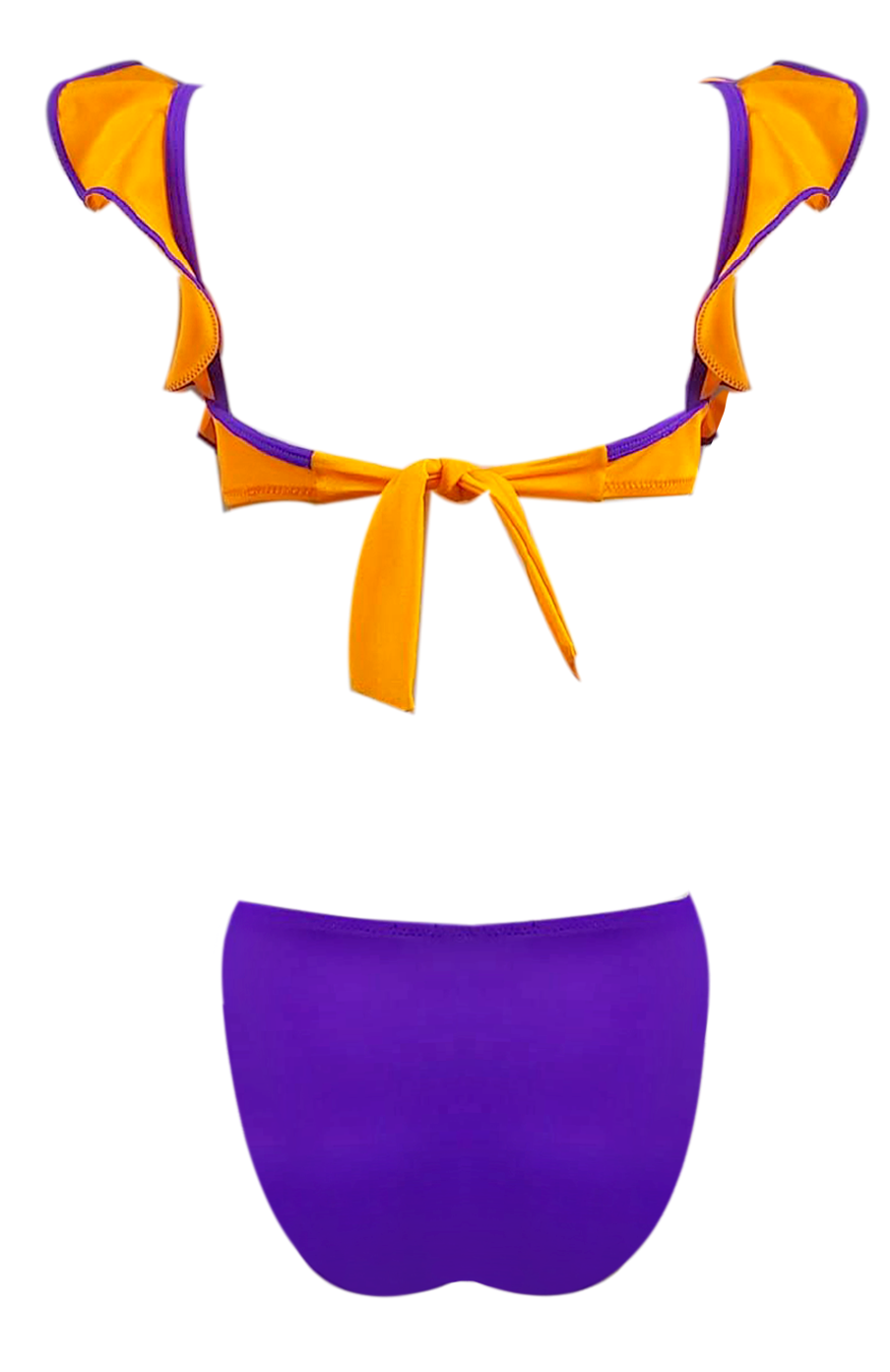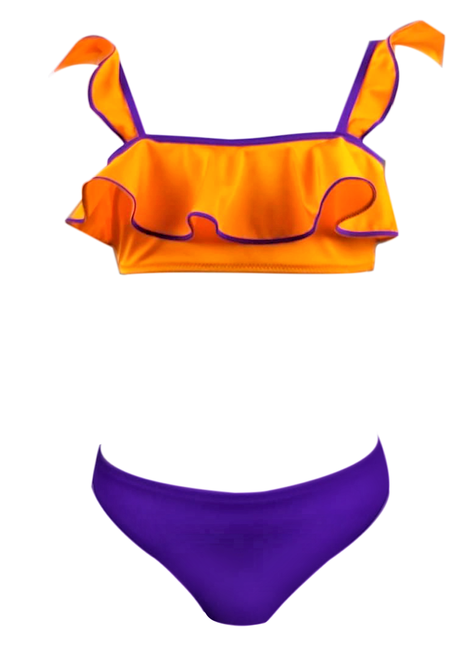 Sony two-piece girl's bikini is perfect for your little ones who love to make a statement. Made from high-quality materials, this swimsuit features vibrant orange and purple colors, ruffle details on both the front and shoulders, purple piping, and adjustable straps at the back. Its unique combination of colors and style are perfect for kids who love to express themselves and be creative.