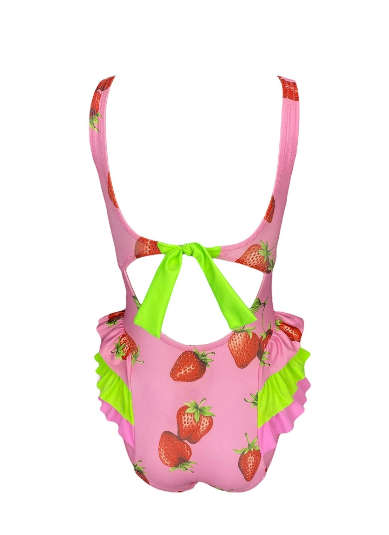 This cute and playful one-piece features ruffled detailing at the side of waist adding texture and interest to the design. The one-piece design allows for a customizable fit, while the ruffles add a touch of fun. Vibrant strawberry print and ribbon at the shoulder perfect for kids who want to add a touch of cuteness to their style. It has a adjustable ribbon at the back for a perfect fit.