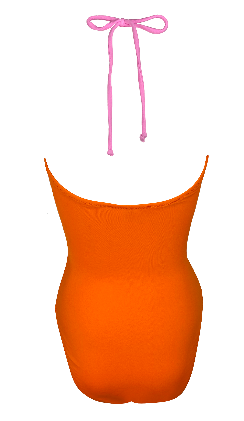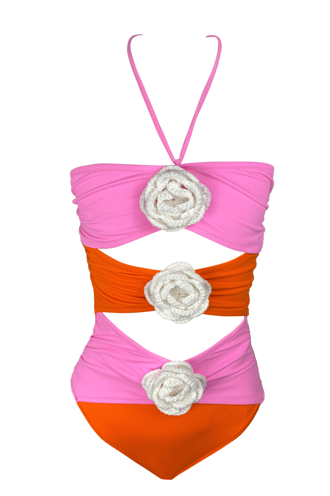Gorgeous pink and orange color combination cutout one-piece,with handmade crochet white flowers.Definately must have classic for every season for the beach or the pool. The special fabric will also protect the skin from the sun's harmful rays,as the UPF 50+ blocks out more than %97 of the UV raditation.