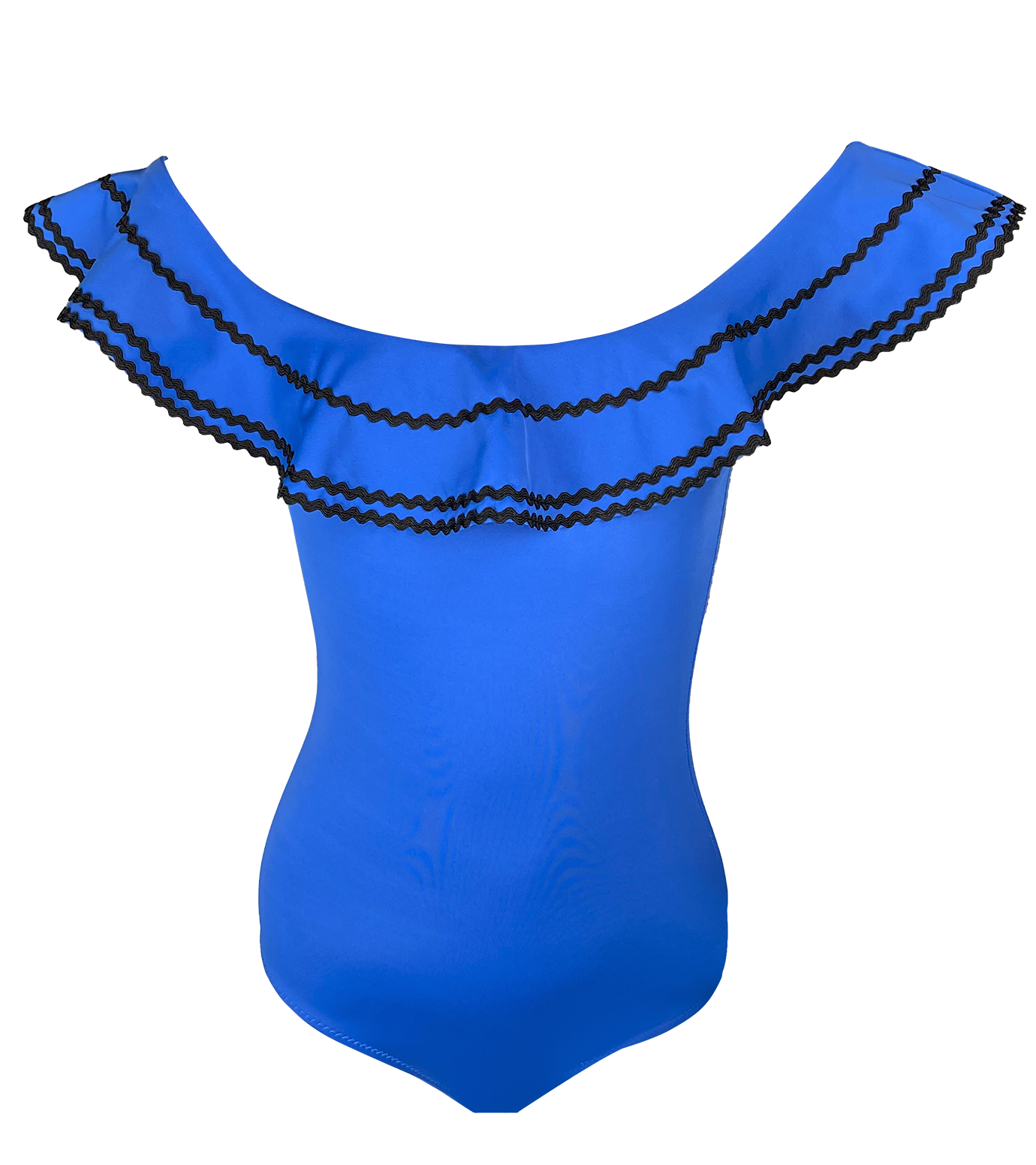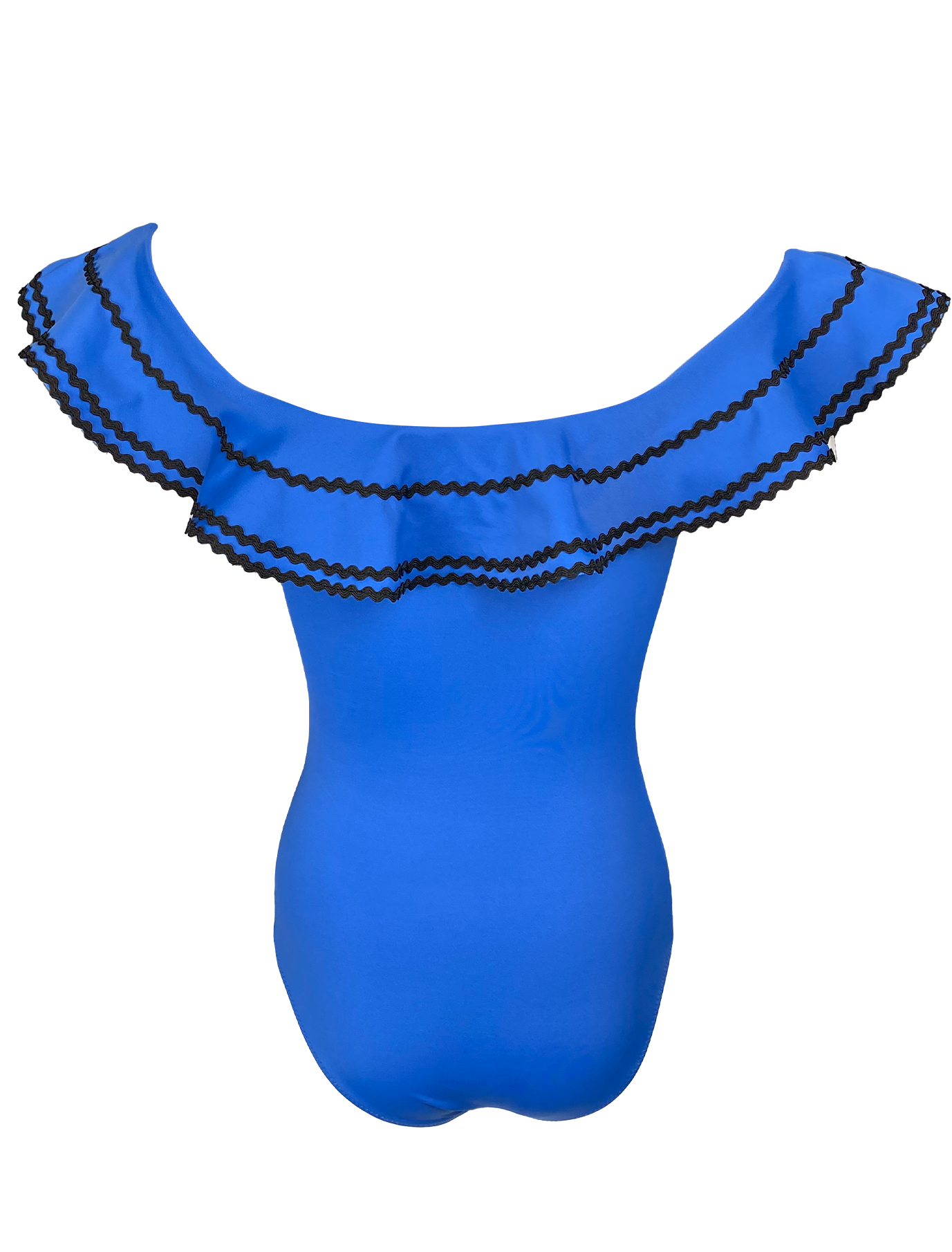 From Nessi Byrd, blue swimsuit for girls made in stretchy smooth fabric. This stylish one-piece has a blue ruffle neckline which can be worn off-the-shoulder for a luxury look.