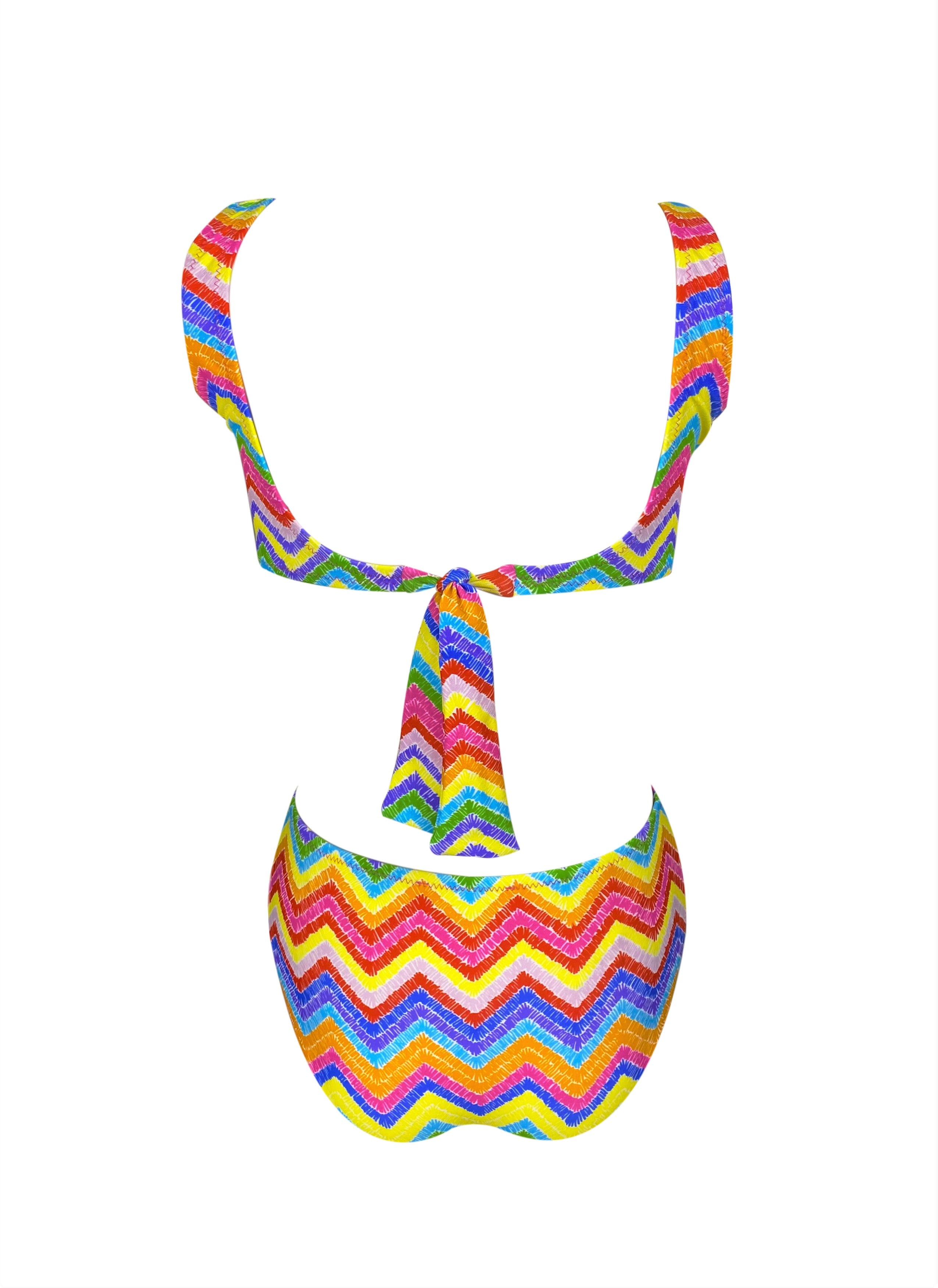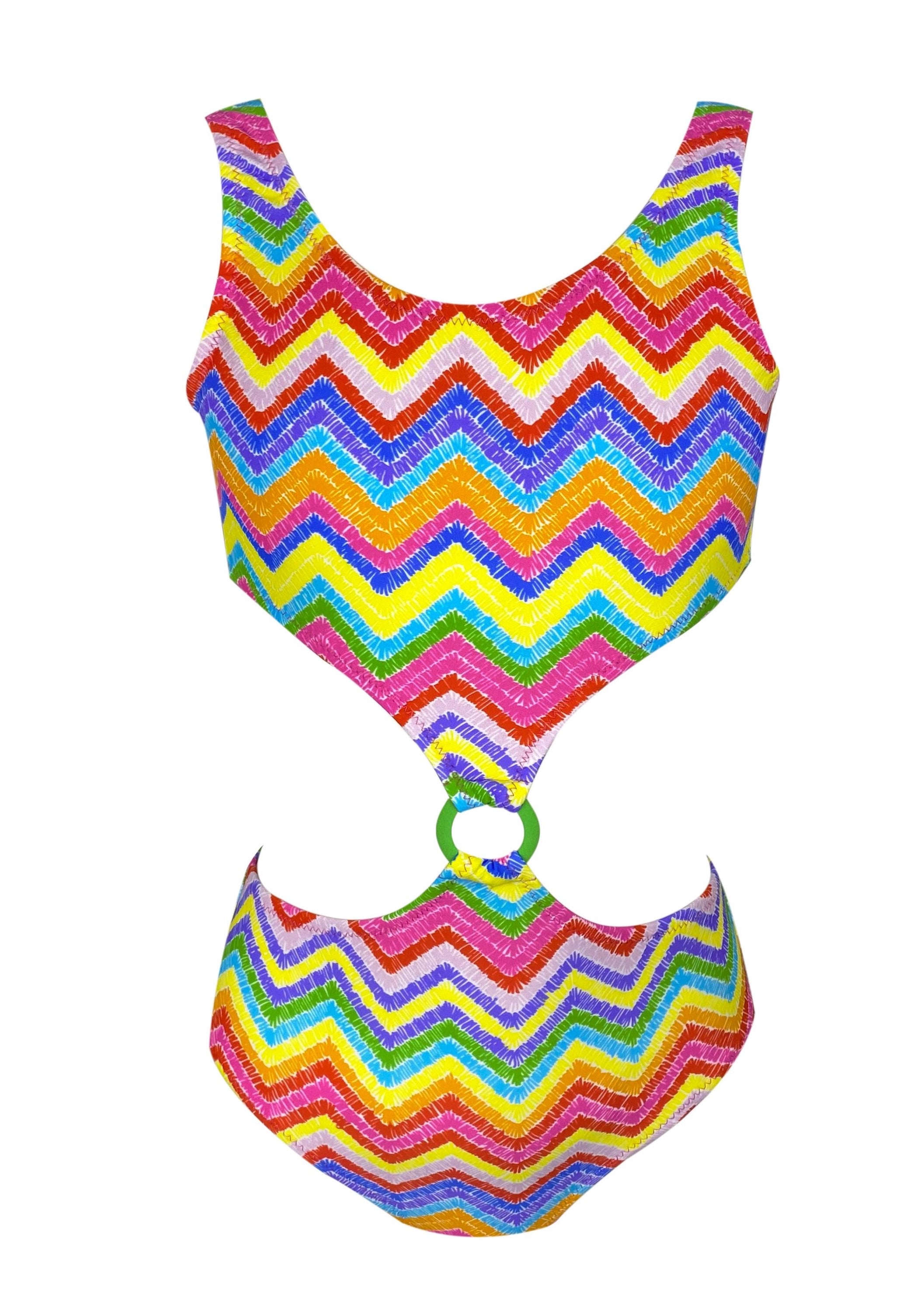 With its eye-catching Zigzag patterned and the cutout design adds a touch of edgy flair with fabric covered ring adds a unique and stylish detail. The open back is adjustable with a back fastening, ensuring a comfortable and perfect fit, this swimsuit is sure to turn heads at the beach or pool. Open back design for extra comfort in the sun. Not only is this swimsuit stylish, but it's also practical.