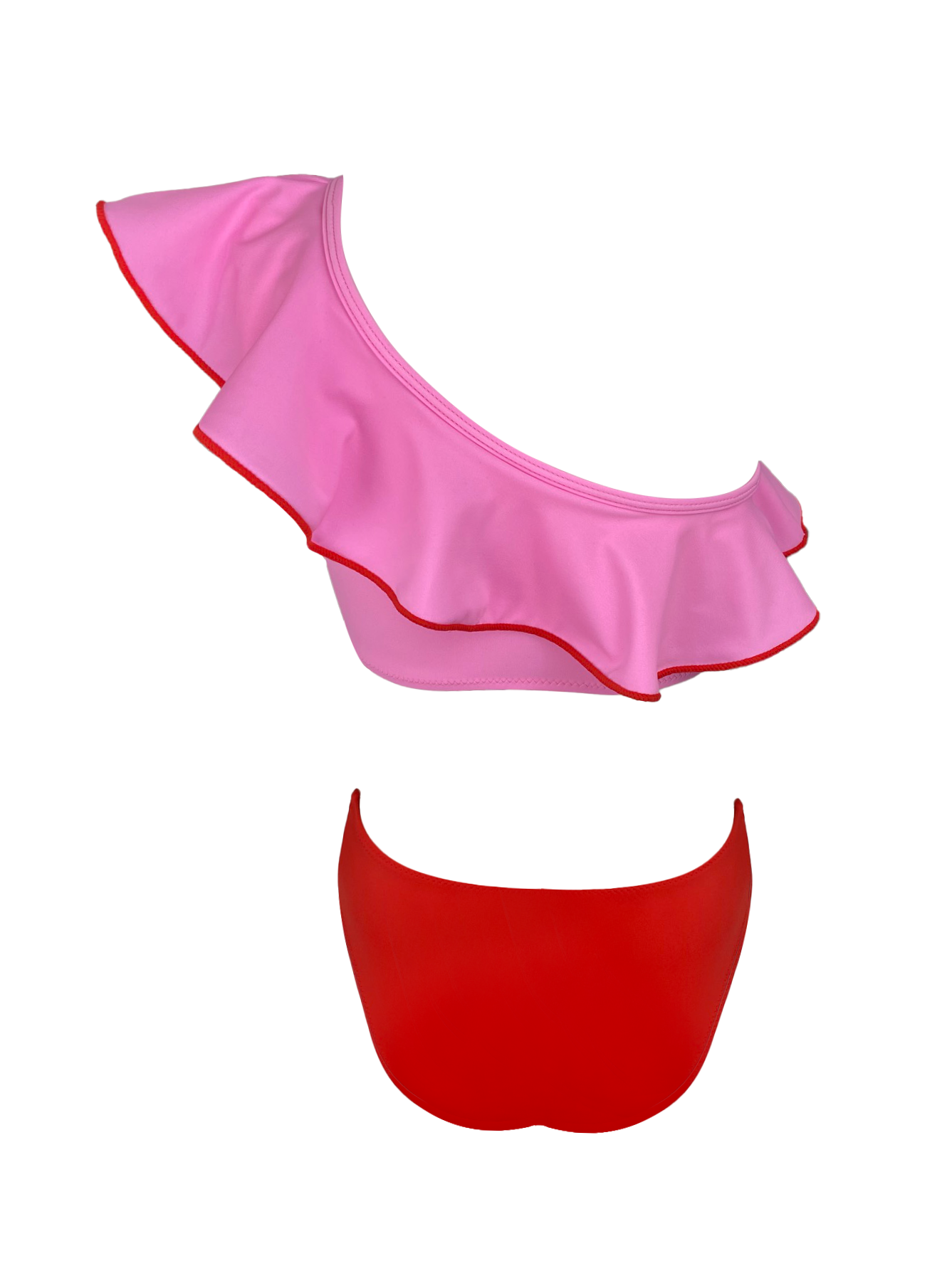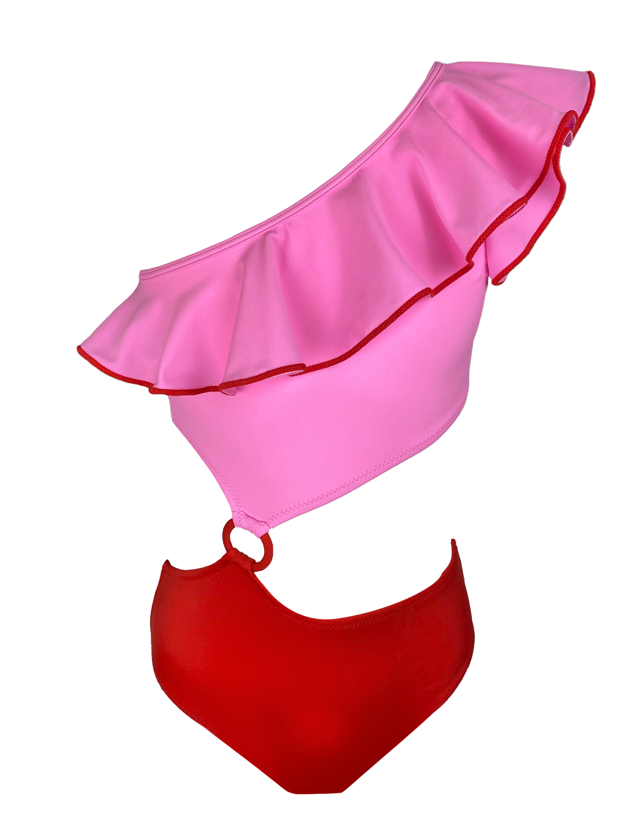 Looking for a chic and stylish swimsuit for your little girl? Our red piping detail ruffled swimsuit with red swimsuit fabric covered ring is the perfect choice!
