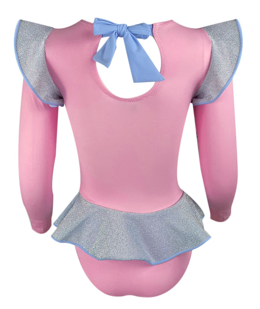Check out our latest one-piece long sleeves swimsuit,decorated with glitter ruffles details! Cute solid blue adjustable ribbon on the back for a luxury touch and perfect fit. Your little one will look cute and confident in this fashionable one-piece at the pool or beach.