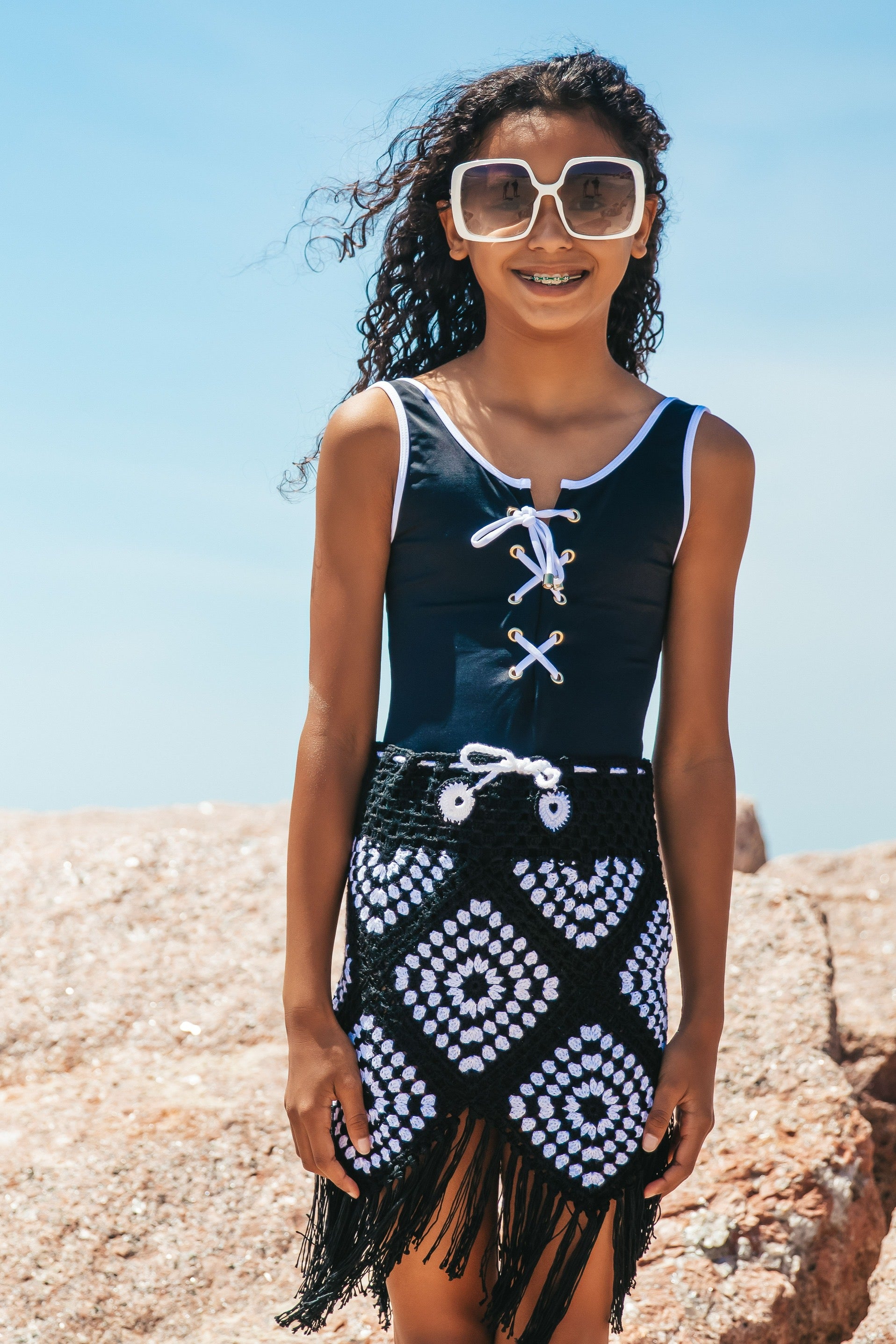 Luxury swimwear brand Nessi Byrd designs this black and white beach skirt for teen girls, crocheted in cotton for a bohemian look. The fringing adds a free-spirited vibe and it has a drawstring waist with fun hearts. This beach-bound style is ideal to wear over a swimsuit at the beach or pool.