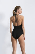 This striking maillot features a high-neck halter silhouette anchored by a polished gold-tone ring, framing the face with jewelry-inspired radiance. The bodice is expertly wrapped in a criss-cross design that reveals a daring center keyhole, while artisanal ruching through the midsection provides a beautifully sculpted and slimming profile.