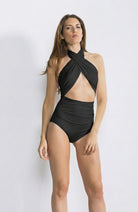 Black stylish women's swimsuit with crossover detail, cross, draped