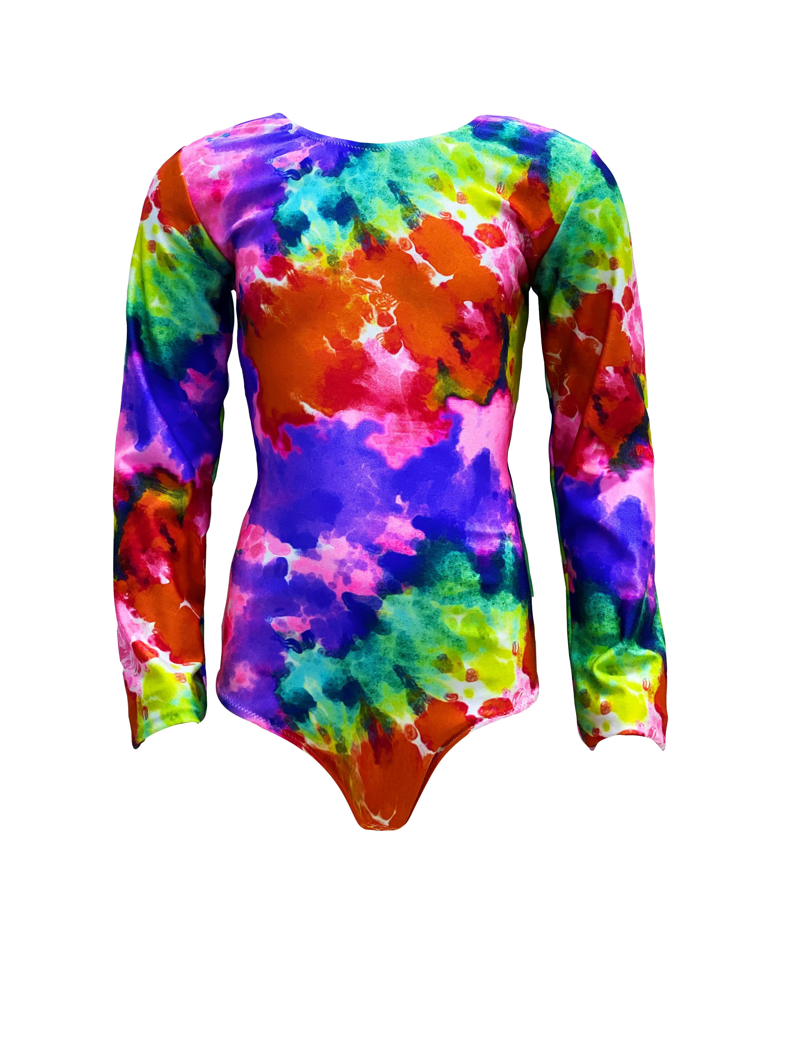 Dive into a wearable explosion of color with this electrifying one-piece swimsuit. This suit is a true work of art, featuring a psychedelic, all-over tie-dye print that bursts with vibrant shades of purple, blue, green, and fiery orange. The sleek, long-sleeve silhouette offers a sporty-chic look while providing excellent coverage and added sun protection.