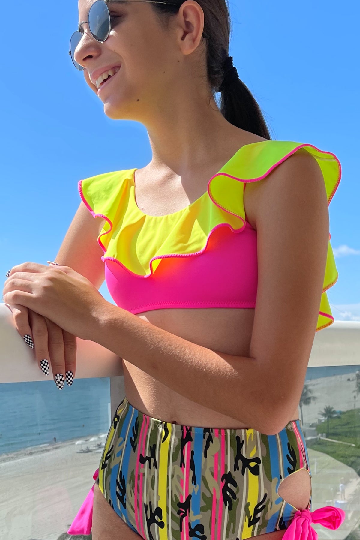 Turn heads with this bold two-tone bikini set featuring a neon lime ruffle top and a vibrant printed bottom. The playful mix of colors and patterns brings a fun, modern twist to your beach look. Designed for comfort and confidence, this piece pairs a soft stretch fabric with statement-making details.