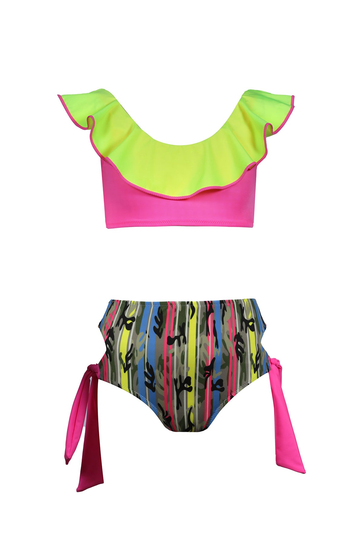 BURGOS Bold Mix Ruffle Bikini Set – Neon Lime & Camo Print