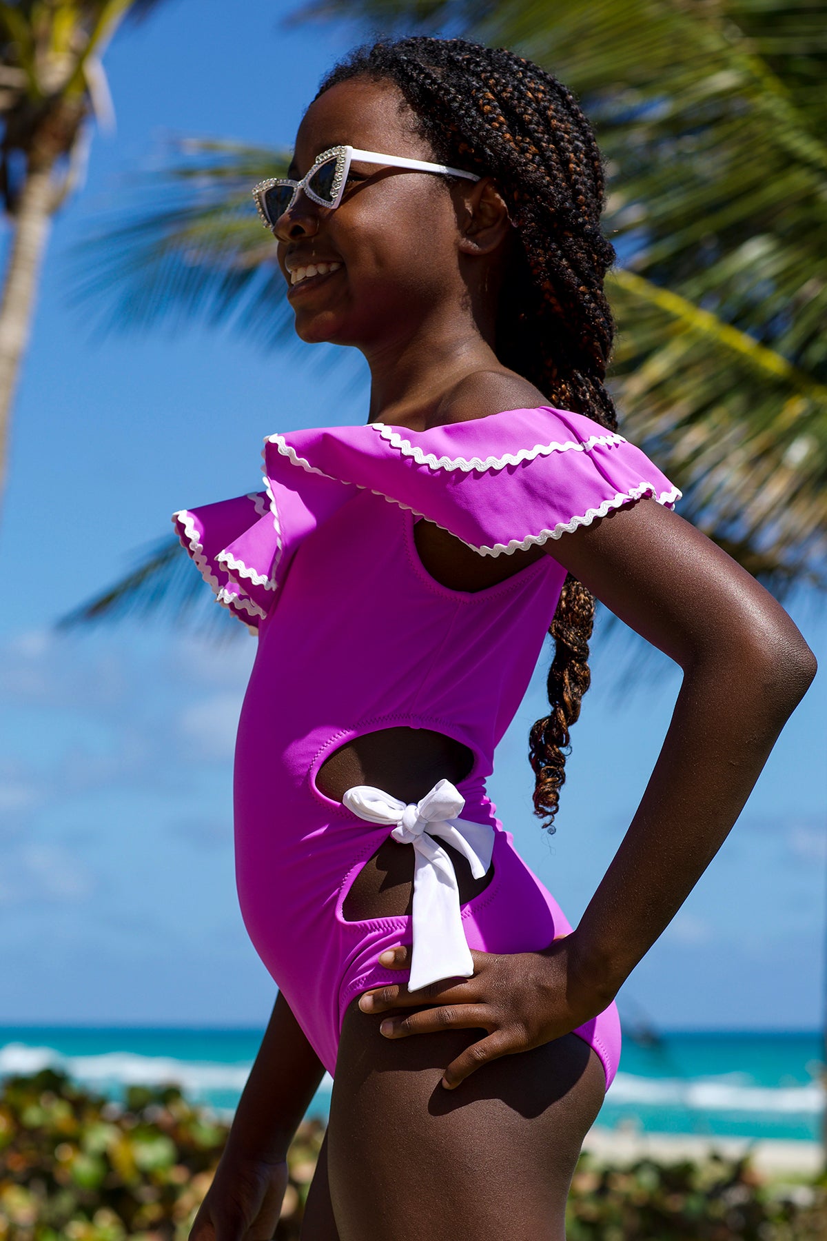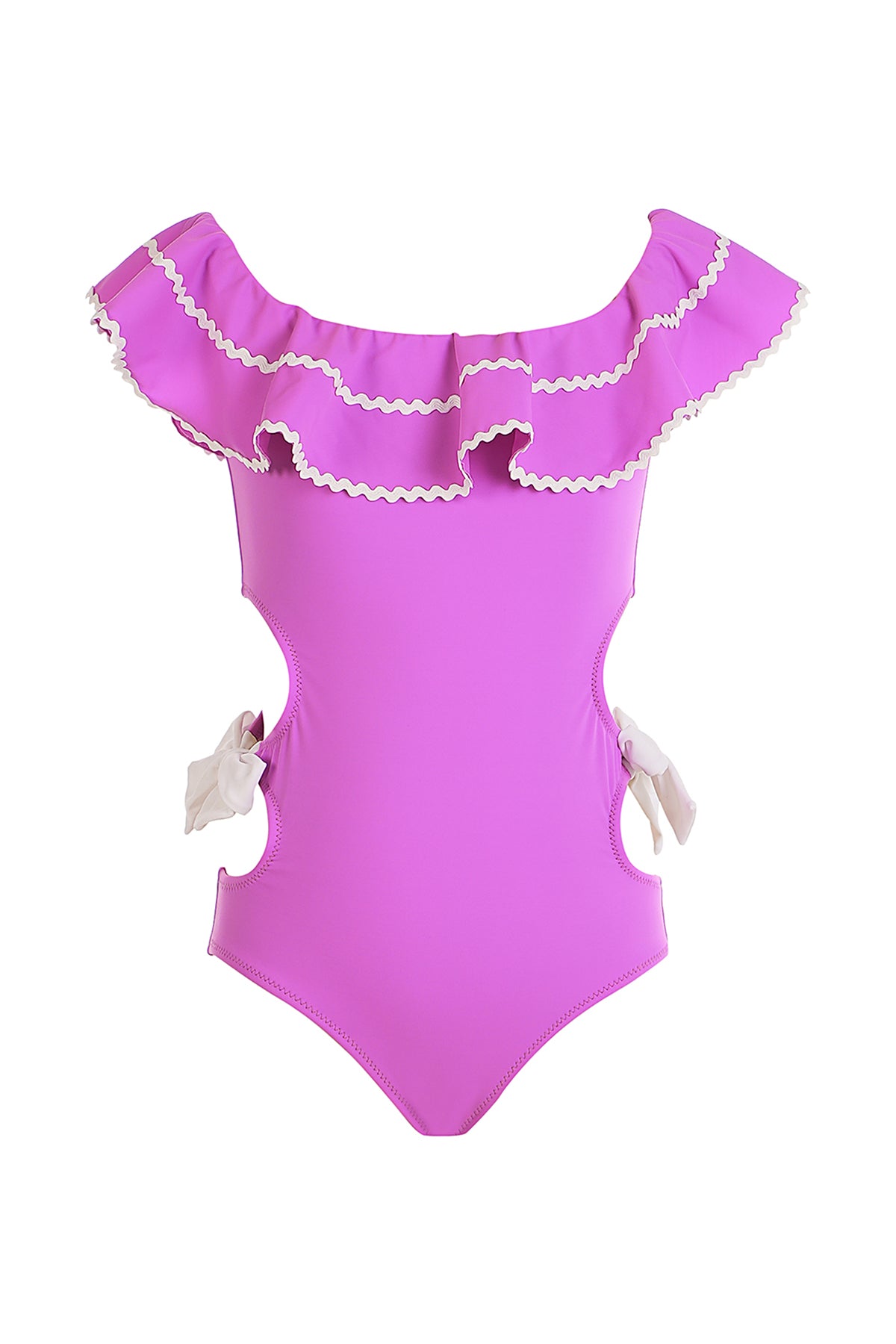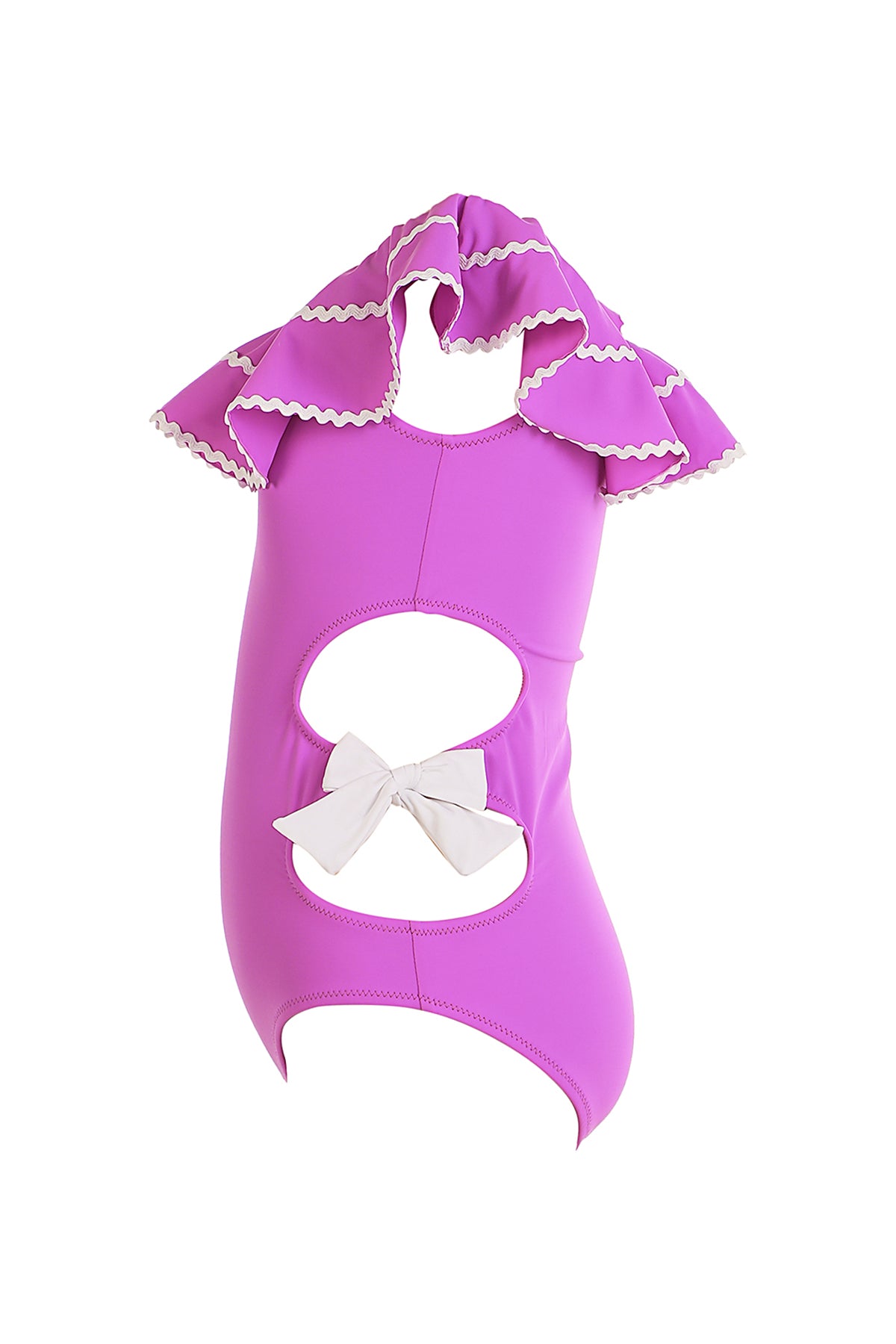 From Nessi Byrd, purple swimsuit for girls made in stretchy smooth fabric. This stylish one-piece has a purple ruffle neckline which can be worn off-the-shoulder for a luxury look.