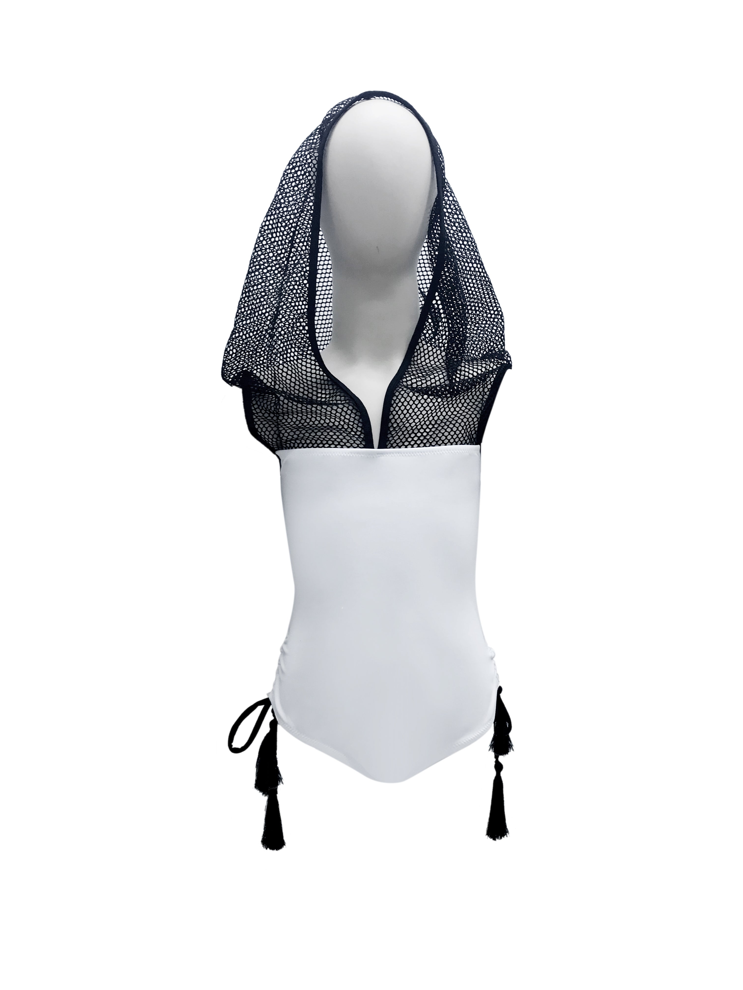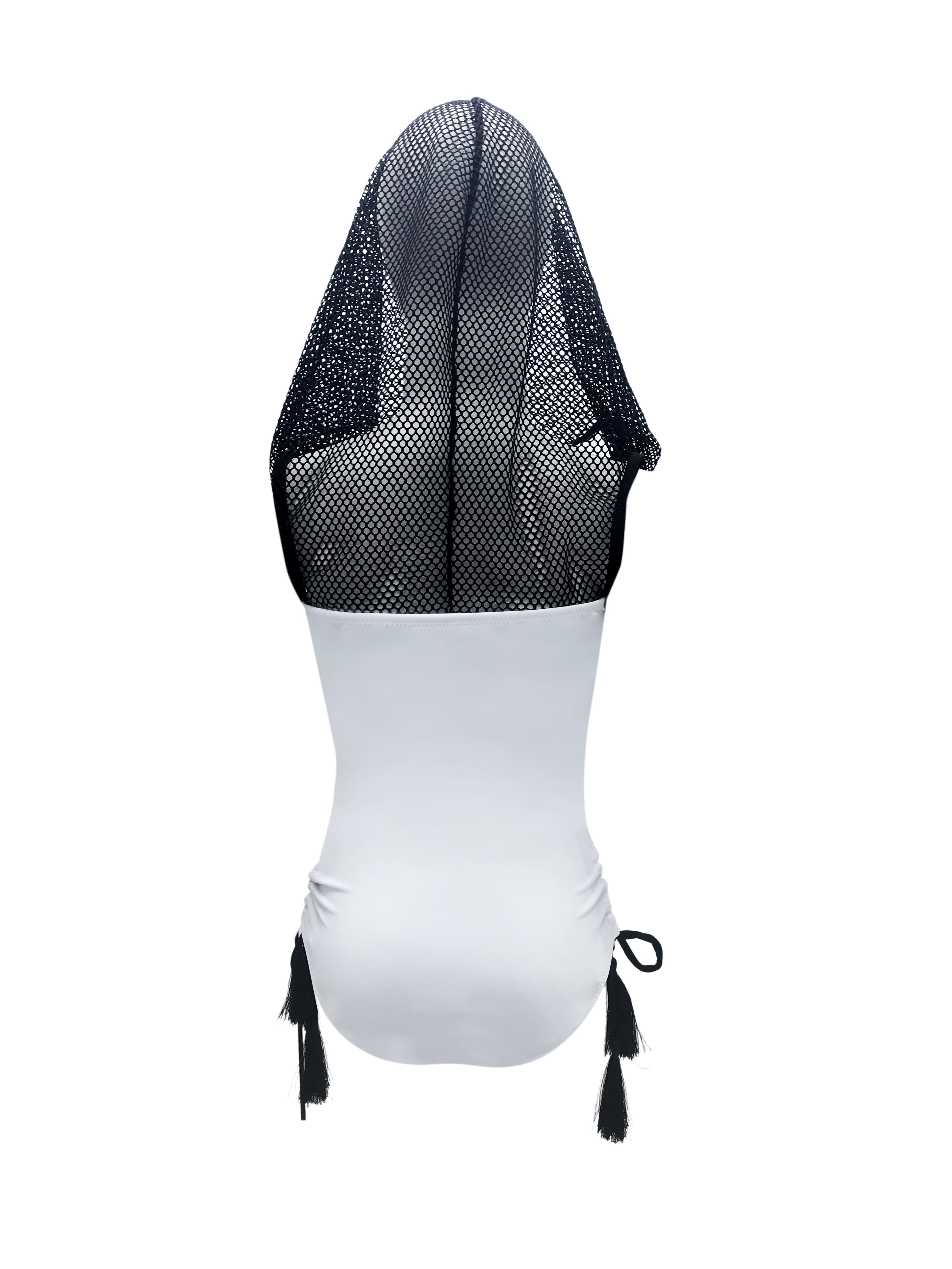 Hara White Sport Mesh Hooded with Tassel Side-Ties One-Piece Swimsuit
