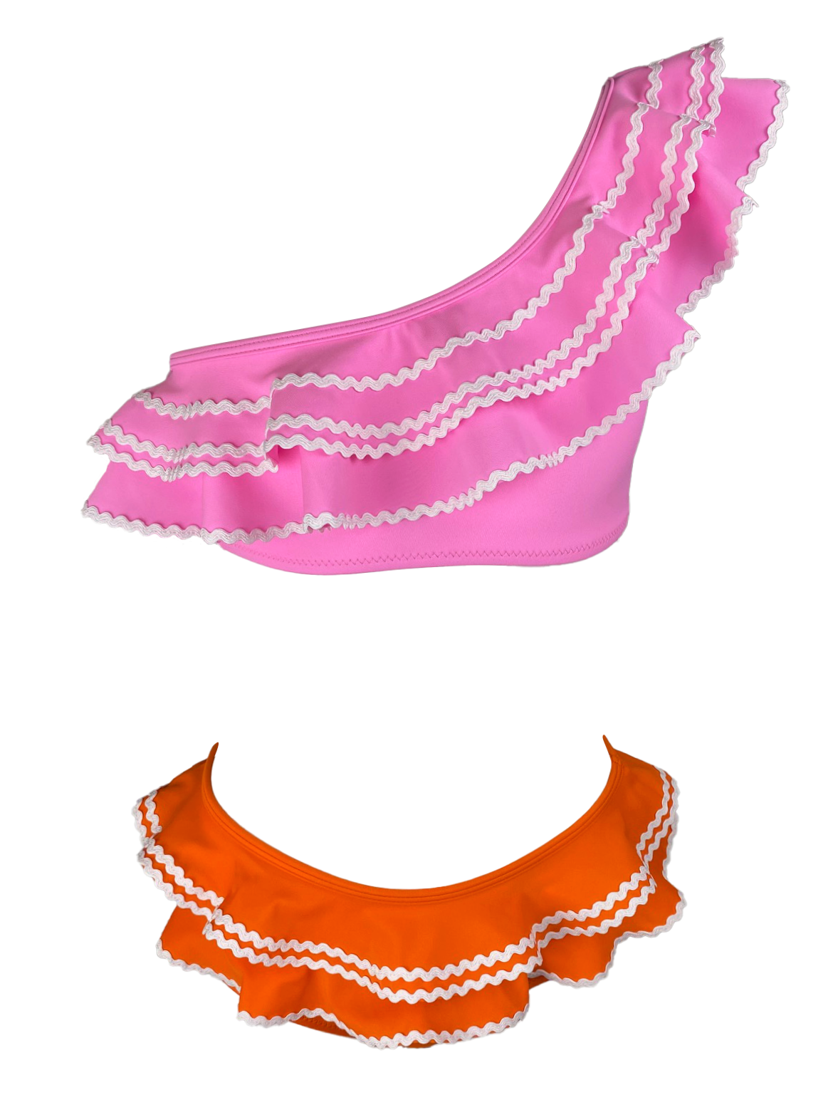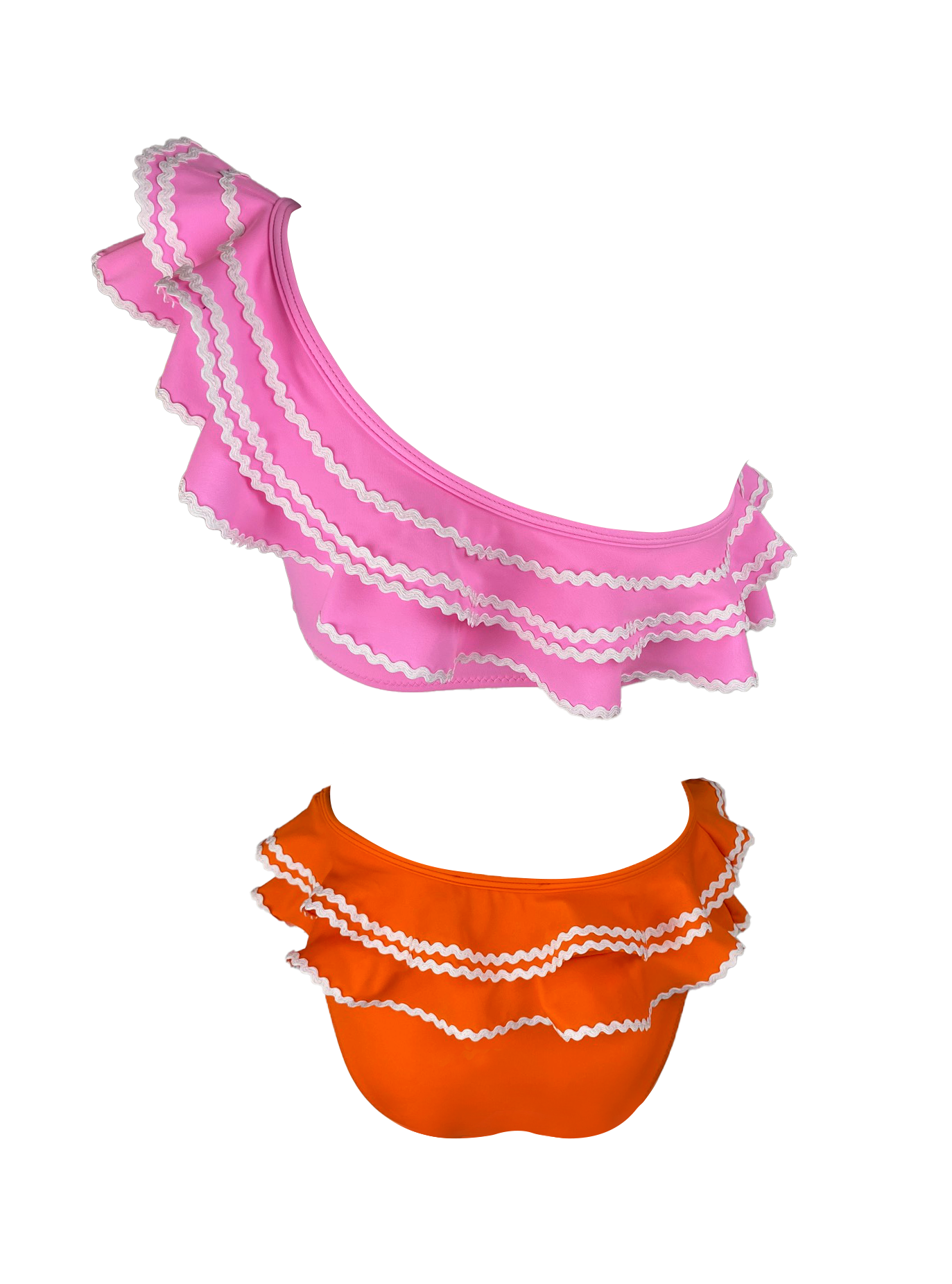 This chic one-shoulder style has a great color combination pink and orange. It has a large ruffle in a one shoulder with pink ric-rac trim and bikini too. This swimsuit its fully lined for comfort.