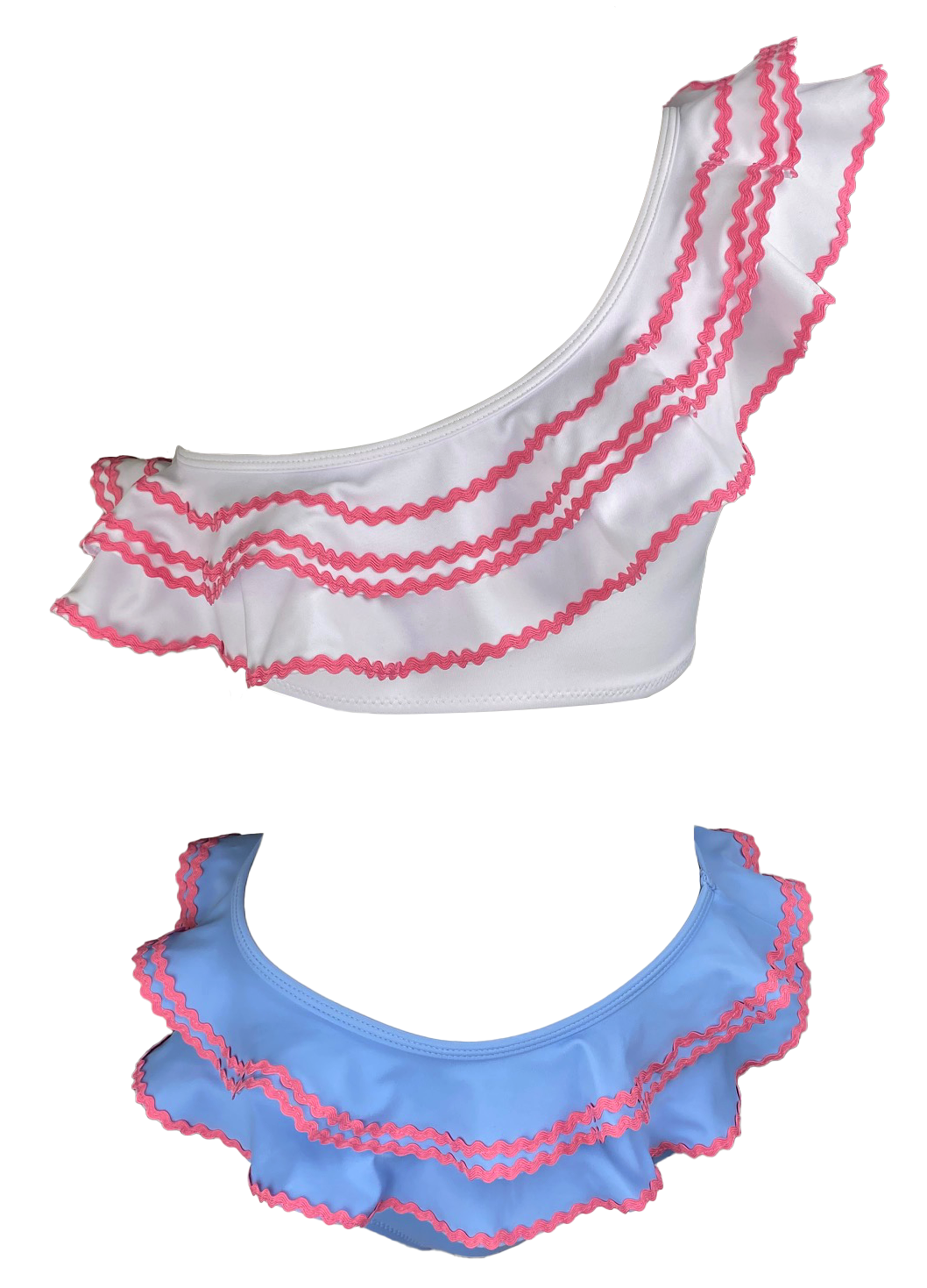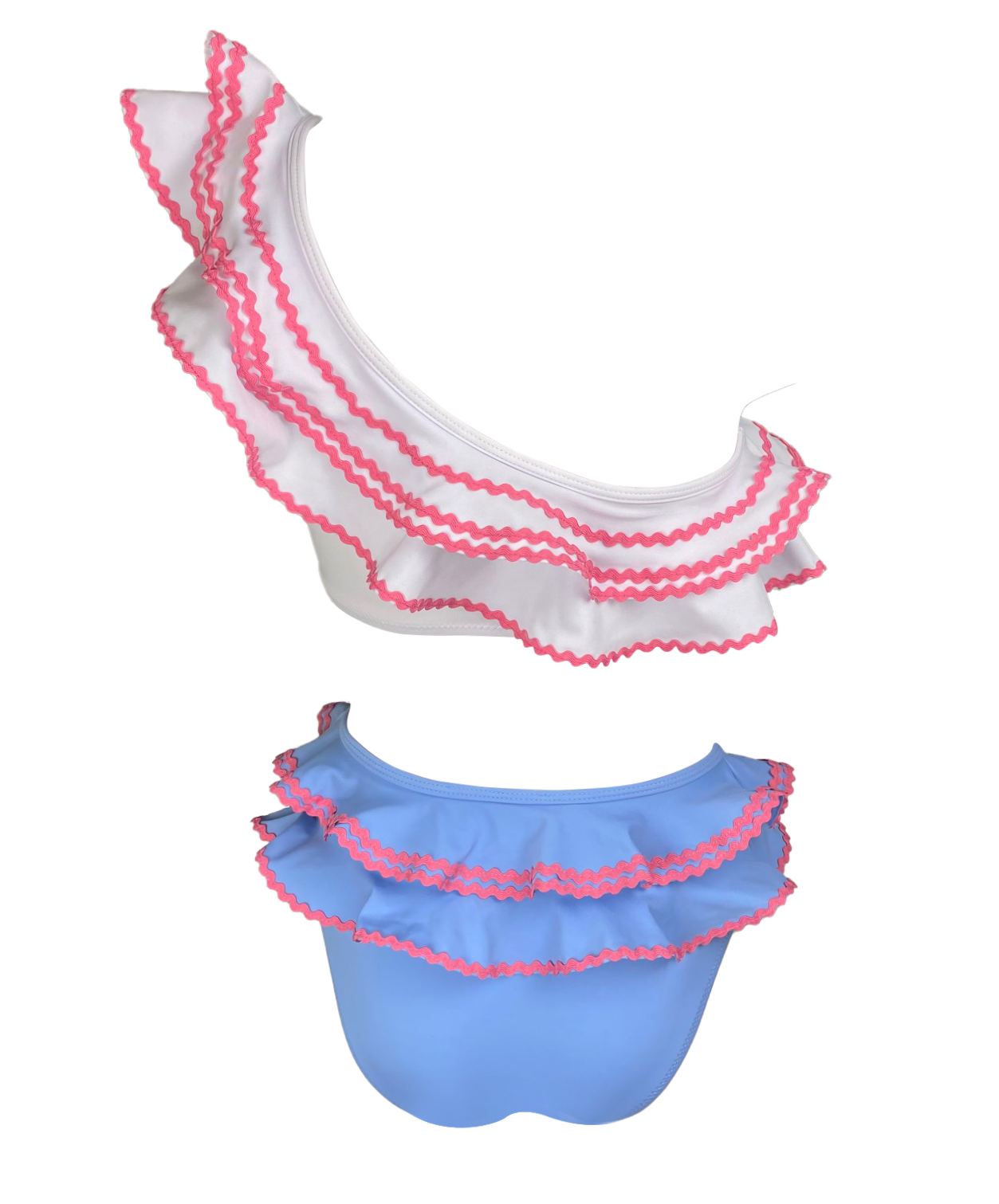 This chic one-shoulder style has a great color combination white and blue. It has a large ruffle in a one shoulder with pink ric-rac trim and bikini too. This swimsuit its fully lined for comfort.