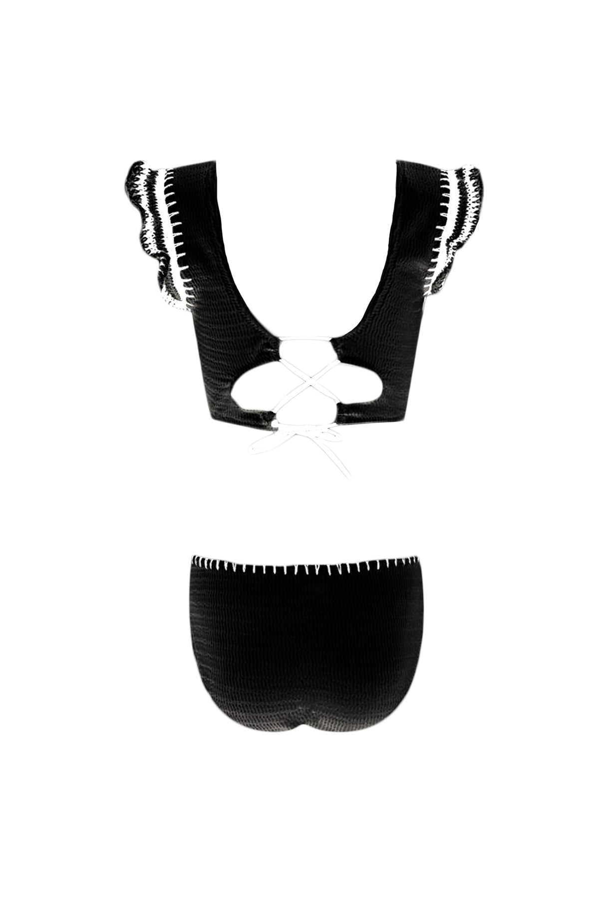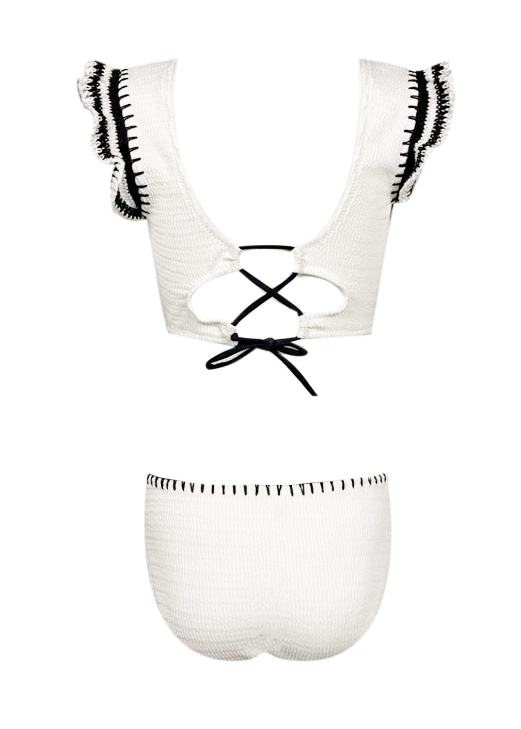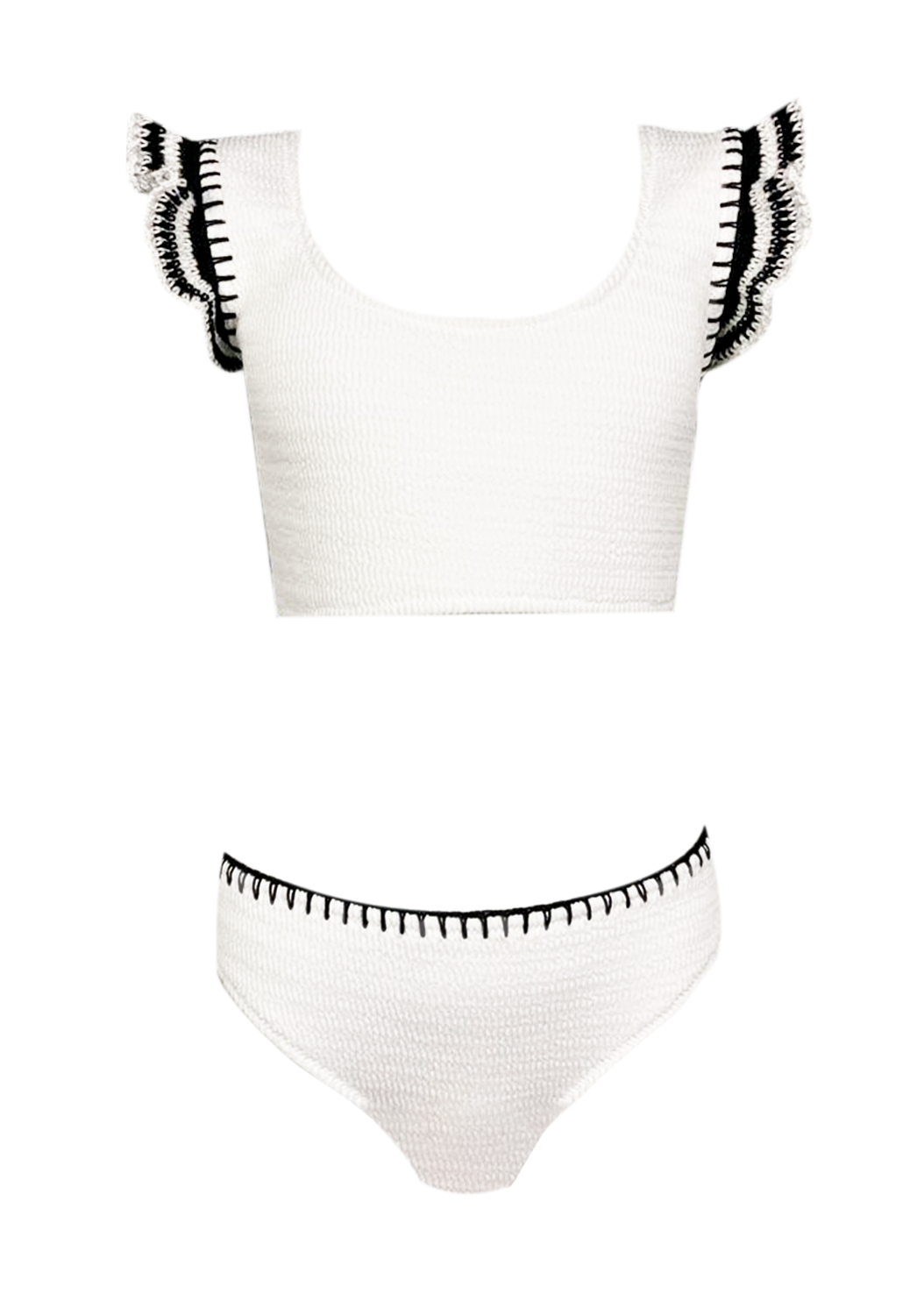 Masha bikini is perfect for your little ones who want to make a statement. Made from high-quality textured fabric, this swimsuit features hand-knitted ruffle details on the shoulders and an adjustable back that will turn heads at the beach or pool. Its stylish and edgy look is perfect for kids who want to add a touch of flair to their beachwear.