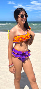 Make a splash with Maya, the perfect swimwear for your little one! This fun, one-shoulder bikini features an eye-catching combination of orange and purple and is adorned with multi-layered frills. Whether they’re playing at the beach or pool, Maya will make sure your child looks and feels great.