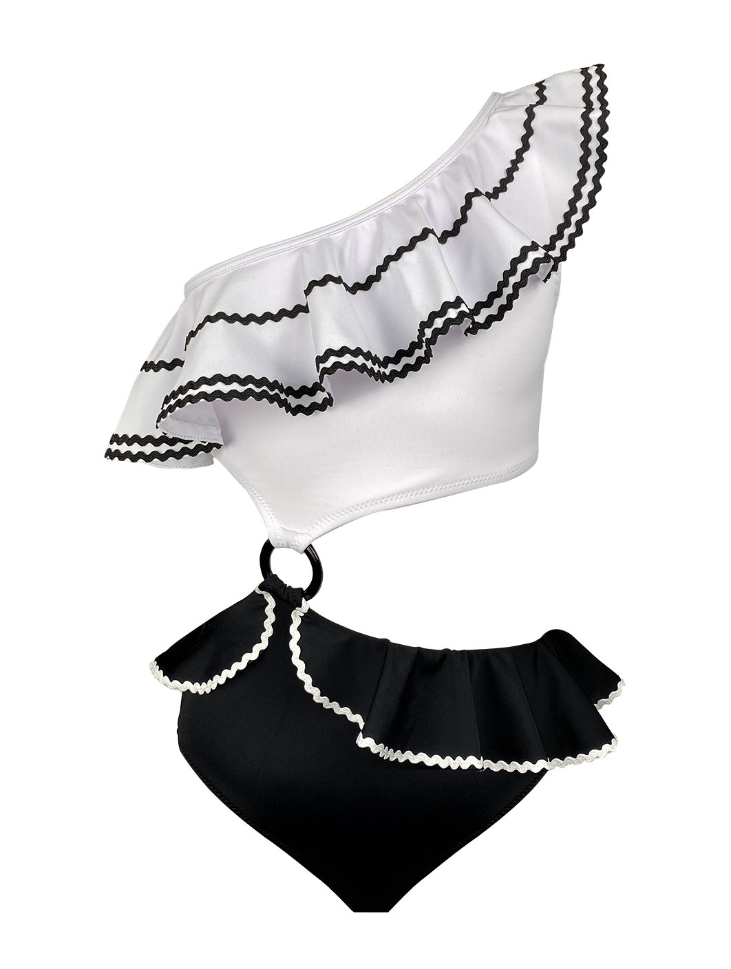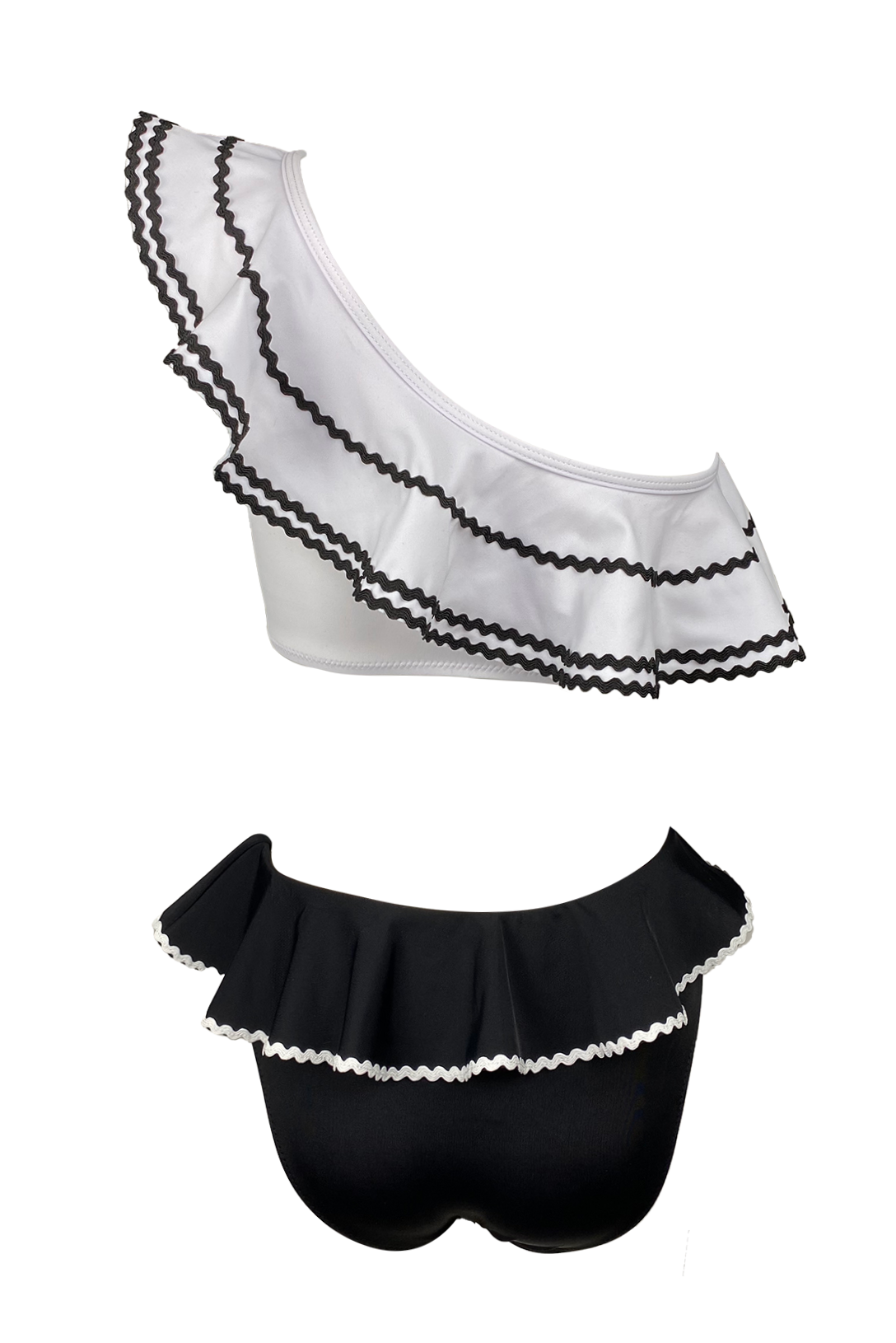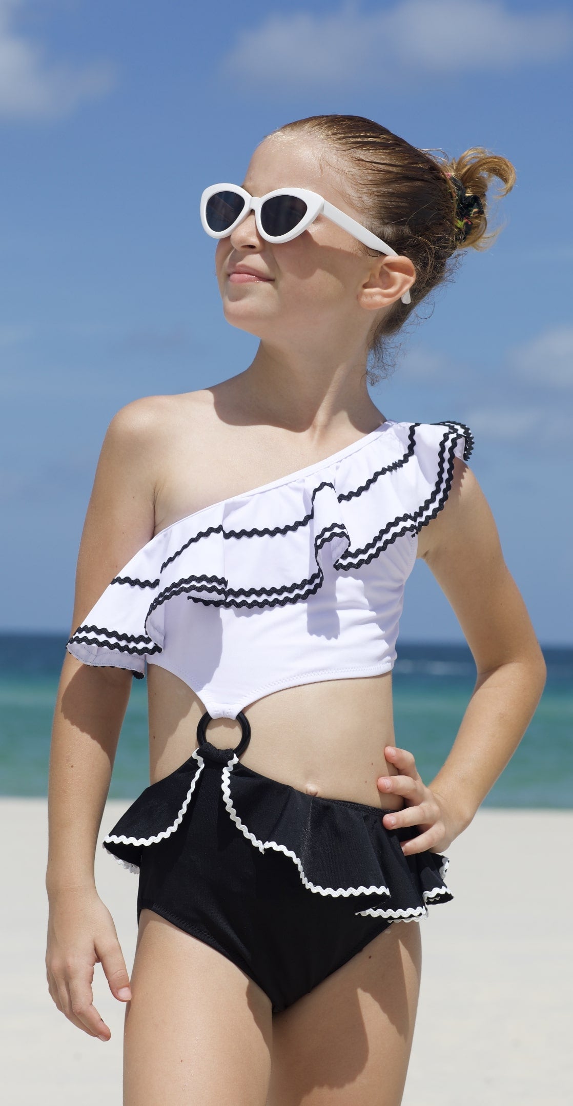 Crafted from high-quality Italian stretchy fabric, this swimsuit is designed to provide a comfortable and perfect fit for your girl. It has a large ruffle in a one shoulder with black ric-rac trim. This swimsuit its fully lined for comfort.The white and black swimsuit fabric covered ring adds a unique and stylish detail. Its a trendy touch, while the ruffled design provides a playful and luxury look.