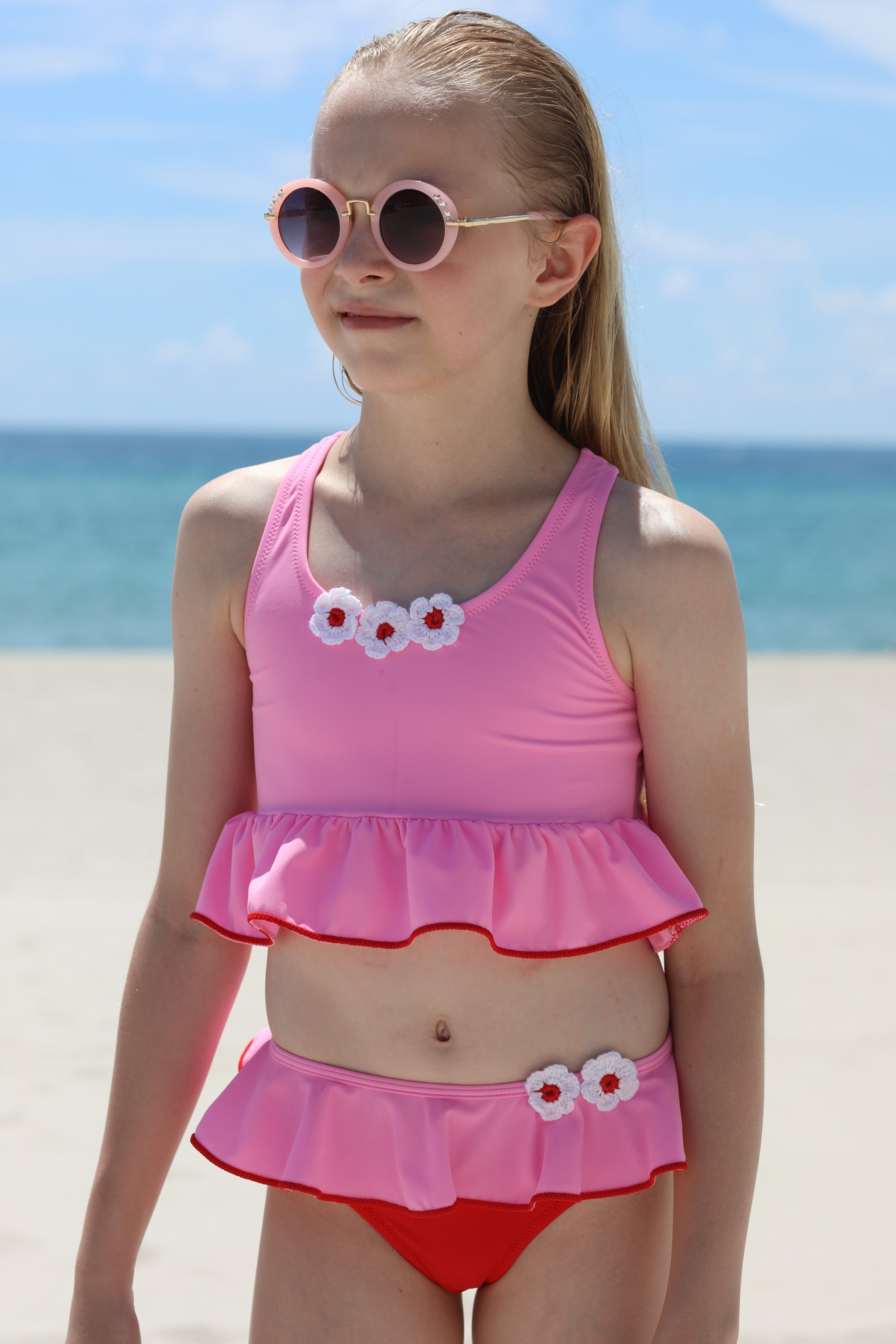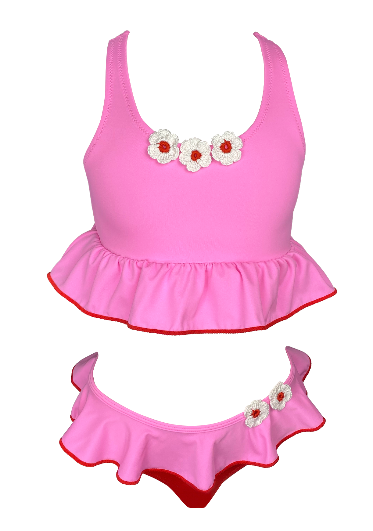This stunning pink swimsuit, red piping with great ruffels and hand-made crochet flowers is the perfect choice for those sunny beach days or poolside lounging. The eye-catching color of pink creates a playful look, while the intricate floral details add a touch of elegance.